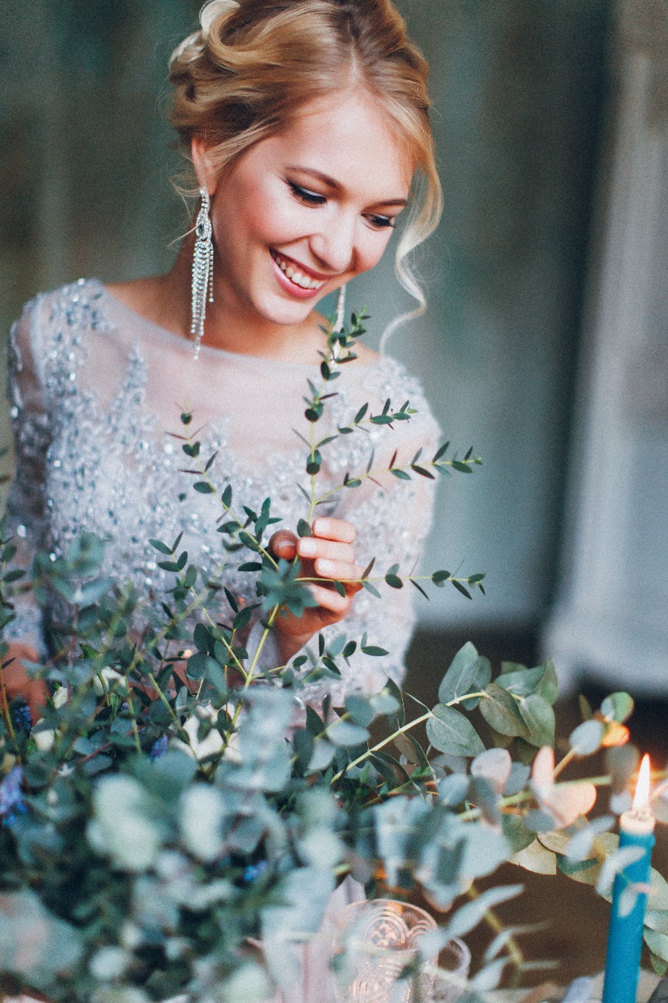От организатора: Для съемки истории любви Антона и Юли мы выбрали белоснежную студию с высокими потолками, большими окнами и винтажной мебелью. Классический стиль и монохромная цветовая гамма в дымчатых тонах помогли дополнить интерьер. Объемные, насыщенные зеленью цветочные композиции, фигурное цветное стекло, хрусталь, античная каменная ваза, полиграфия — все эти детали сложились в единое целое, чтобы создать особую атмосферу этого сказочного дня.