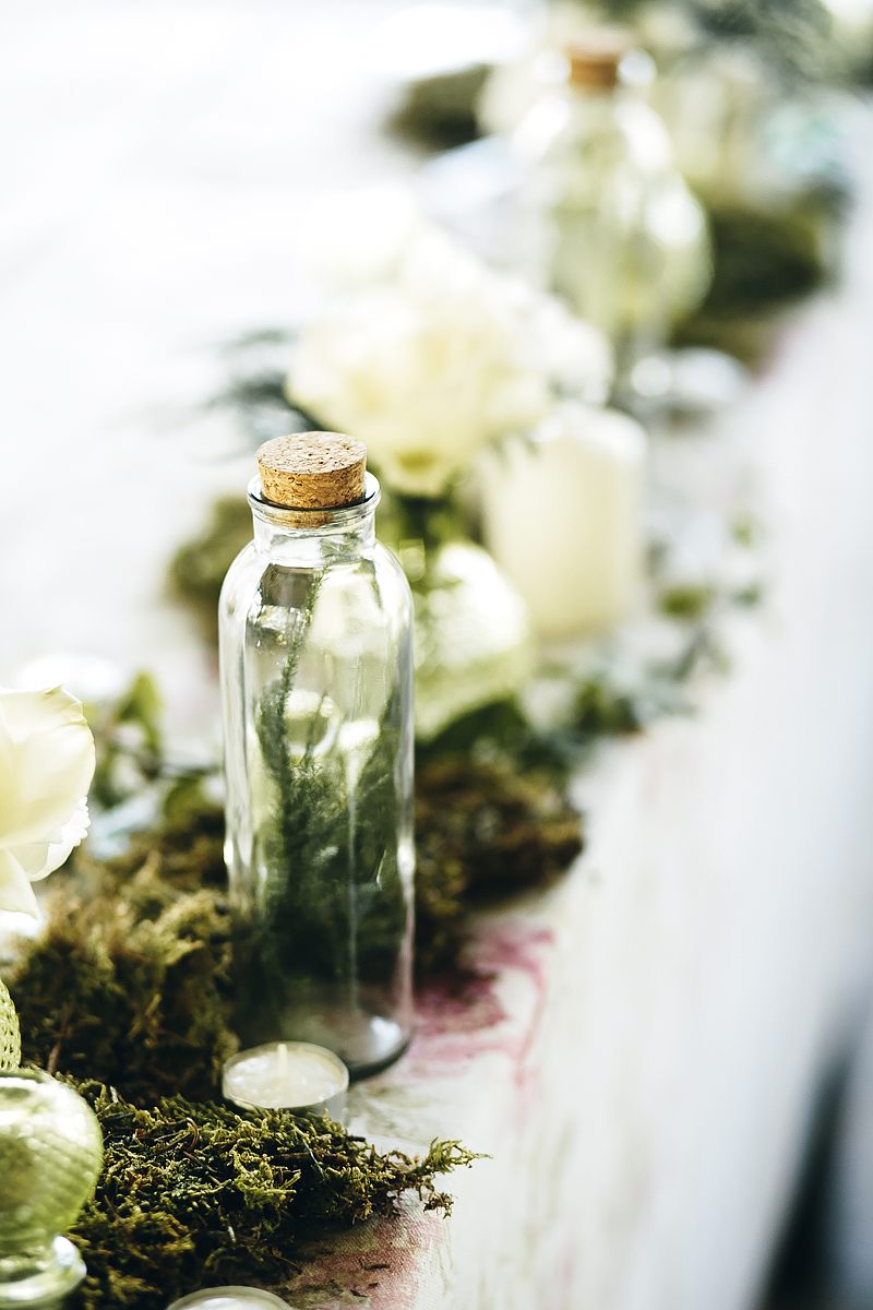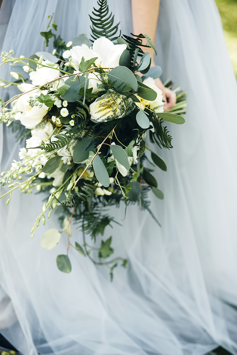 Стиль и цветовую гамму свадьбы мы решили выбрать максимально приближенную к природе. Легкая прическа, невидимый макияж, летящее платье, простой костюм жениха из натуральных материалов — все то, что можно отнести к стилю «ботаника». Из цветов мы использовали в основном зелень, много папоротника, плющ, аспарагус, мох, зелень эвкалипта, садовые розы, пионы.