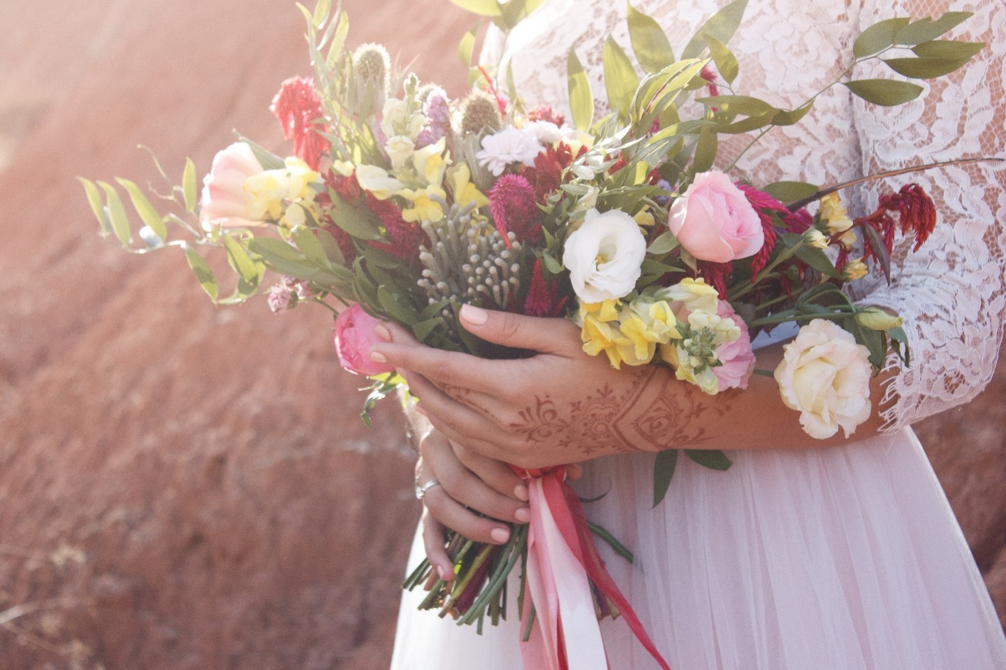 Для нас было важно подчеркнуть необычность места, в котором мы проводили предсвадебную съемку, приправив пейзажи нотками востока. Мехенди, вигвам, тика, ловец снов, букет свободной формы и яркий текстиль создали необходимое настроение и выглядели аутентично на фоне красных гор Богдо.