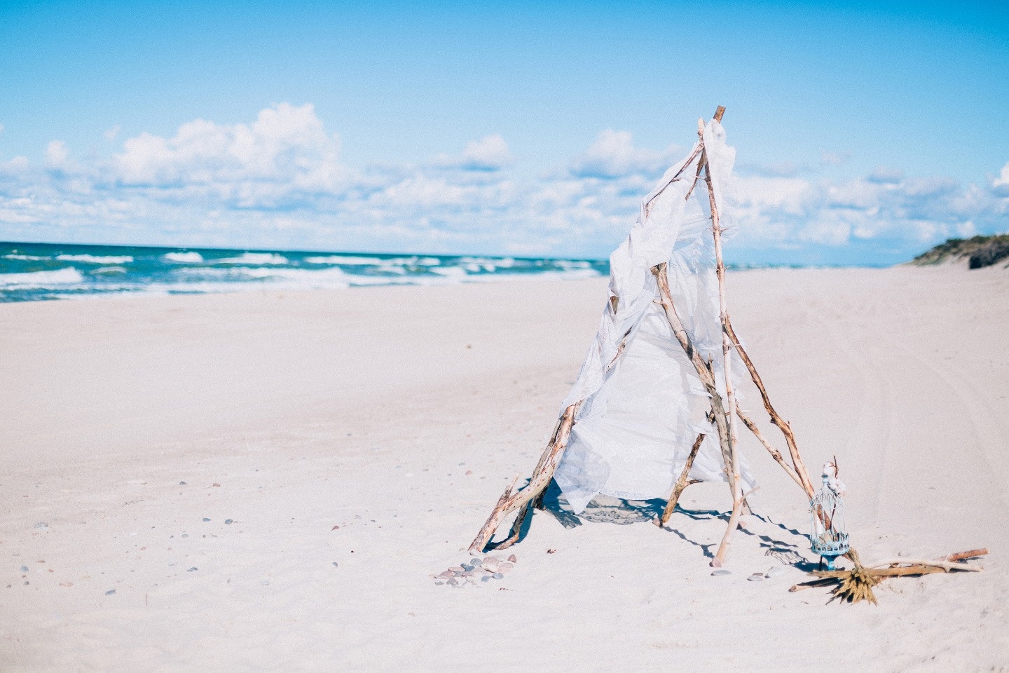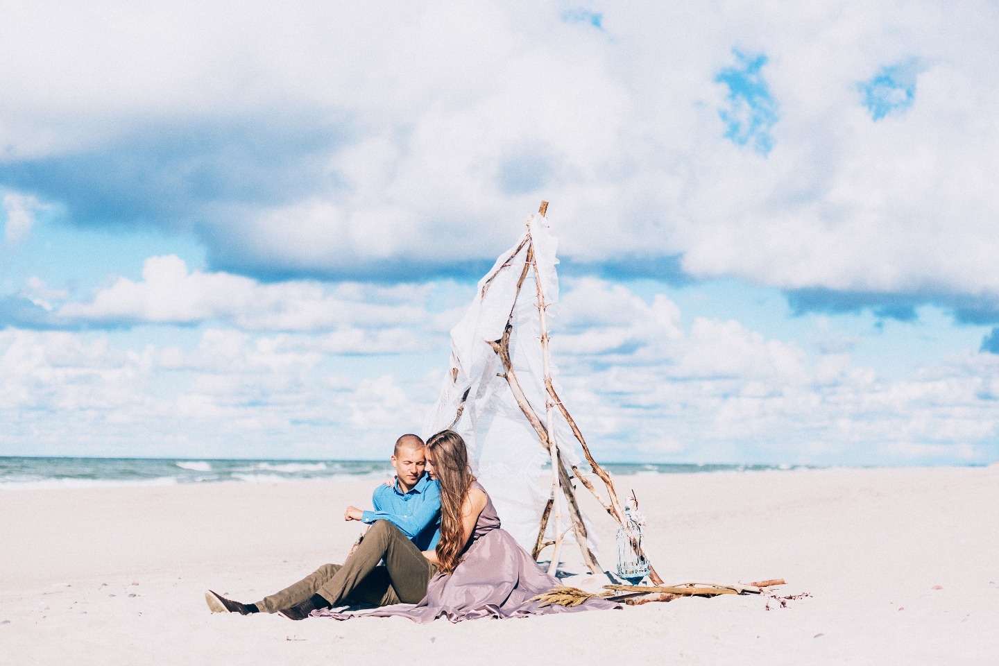 Съемка проходила в конце сентября, а это достаточно холодный сезон на побережье Балтийского моря. Утро началось рано — необходимые для импровизированного вигвама ветви и стволы деревьев нужно было найти на берегу. До приезда пары было сделано неприятное открытие — на красивой старой занавеске появилась желтая канва! Пришлось скорее отрезать ее со всех сторон. Но все прошло удачно, даже не смотря на то, что ветер уносил слова и в большинстве случаев мы изъяснялись жестами. Наша пара стоически вынесла холод в легком блекло-сиреневом платье и лазурной рубашке, хорошо продуваемой со всех сторон. Вот почему ветер совсем не мешал нам, а стал одним из героев съемки, как бы испытывая и в то же время оберегая нашу пару.