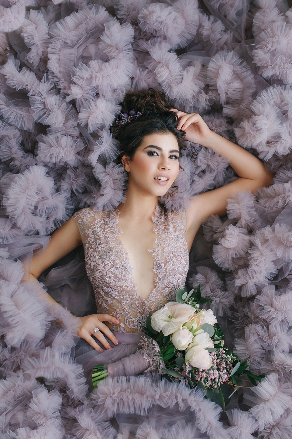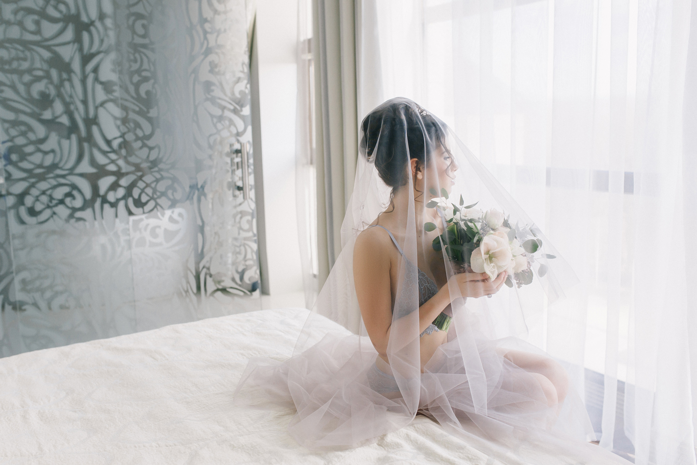 Наша команда решила подчеркнуть женскую красоту, молодость, легкую сексуальность, а также разрушить стереотипы о суете, поспешных сборах, нервных переживаниях и показать, что утро невесты может быть другим: нежным и спокойным.