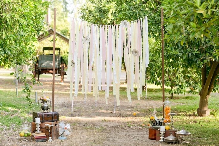 В оформлении зоны церемонии, свадебного ужина или утра невесты можно использовать традиционные материалы стиля шебби шик: например, вместо классических композиций на столе поставить клетки или чайники с чайными чашками. Зону церемонии может оформлять кованая ширма, рамы с кружевом или арка квадратной формы с сотнями жемчужных нитей.