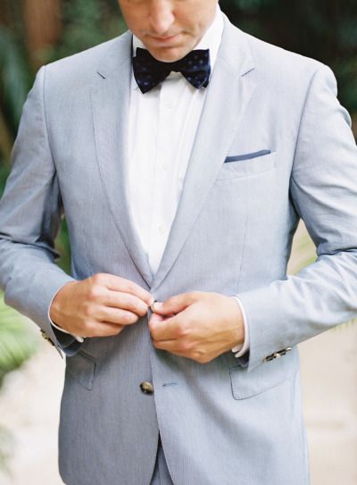 Образ жениха также не стоит утяжелять. Для поклонников классики отлично подойдет смокинг или костюм-тройка, желательно светлых цветов. А галстук можно заменить на шейный платок или бабочку. А если вы поклонники нестандартных образов, то дополните костюм жилетом и подтяжками.