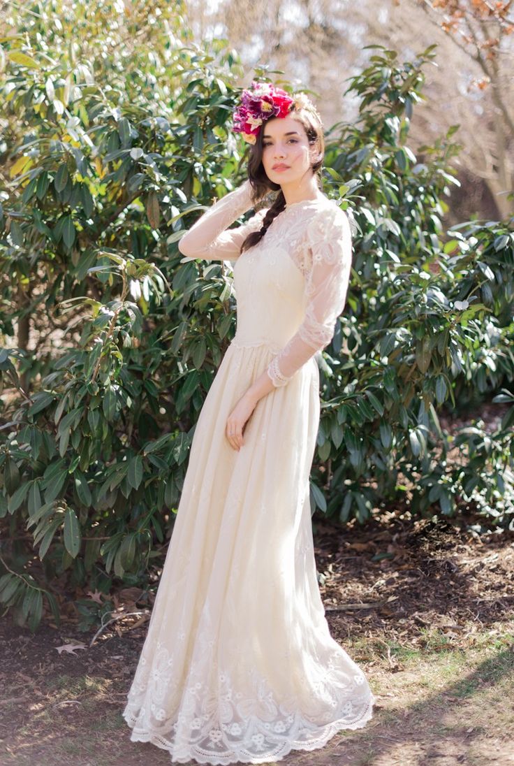 Дизайн должен быть лаконичным и не перегруженным деталями, а также напоминать платья прошедших времен: например, уместными будут горловина-стойка, рукава «летучая мышь» или камея на воротнике. Вместо классических цветов можно выбрать приглушенные, как будто пыльные, оттенки розового и пудрового.