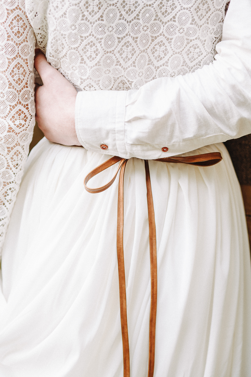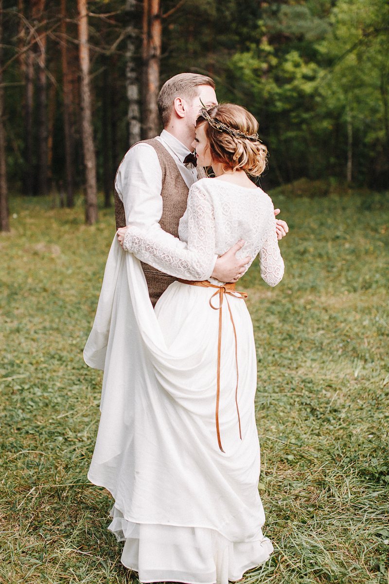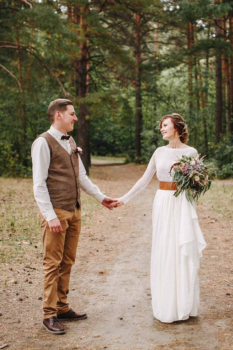 Стили эко и рустик предполагают простые и легкие образы. Платье мы шили с молодым дизайнером, кропотливо выбирали кружево, чтобы оно было простым по своей фактуре и соответствовало «деревенскому» стилю. Платье цвета слоновой кости с легким струящимся подолом и небольшим шлейфом, кожаный ремень коричневого цвета и венок стали основой моего образа.