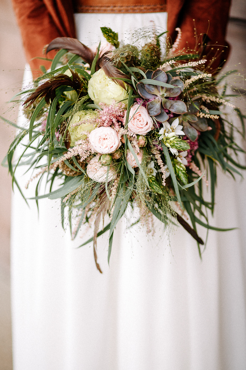 Уже позже, учитывая сезон, был подобран жакет в цвет ремня. В данном стиле можно отходить от традиций, поэтому взамен белым свадебным туфелькам были выбраны летние ботильоны. Особое внимание я обращала на макияж и прическу. В процессе подготовки мне даже пришлось сменить стилиста за день до свадьбы, так как меня не удовлетворил результат репетиции макияжа и прически. Букет, бутоньерка и венок были изготовлены на заказ с обилием зелени и суккулентов.