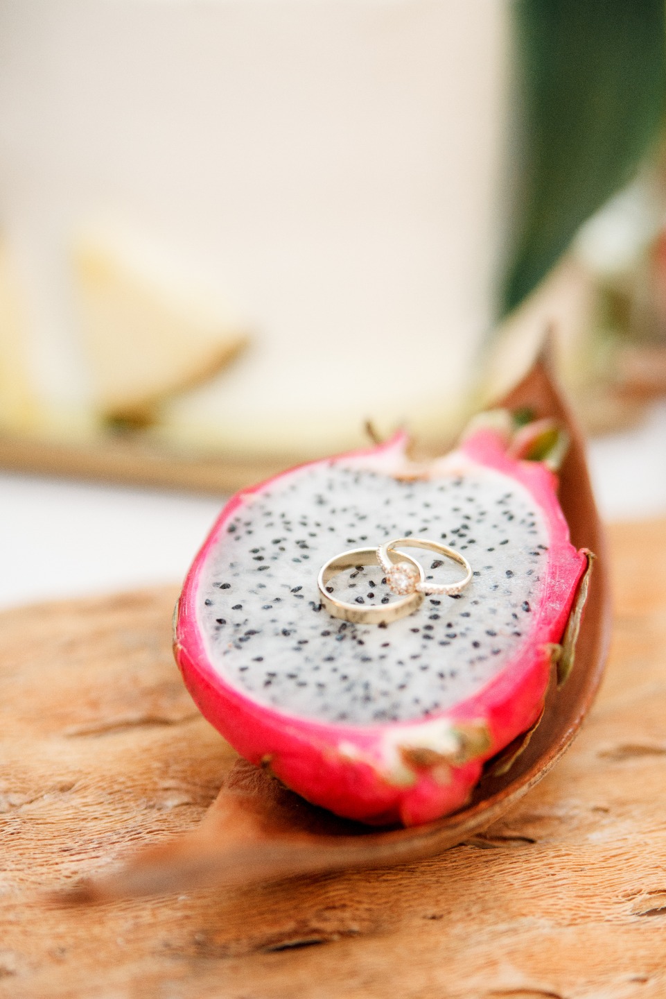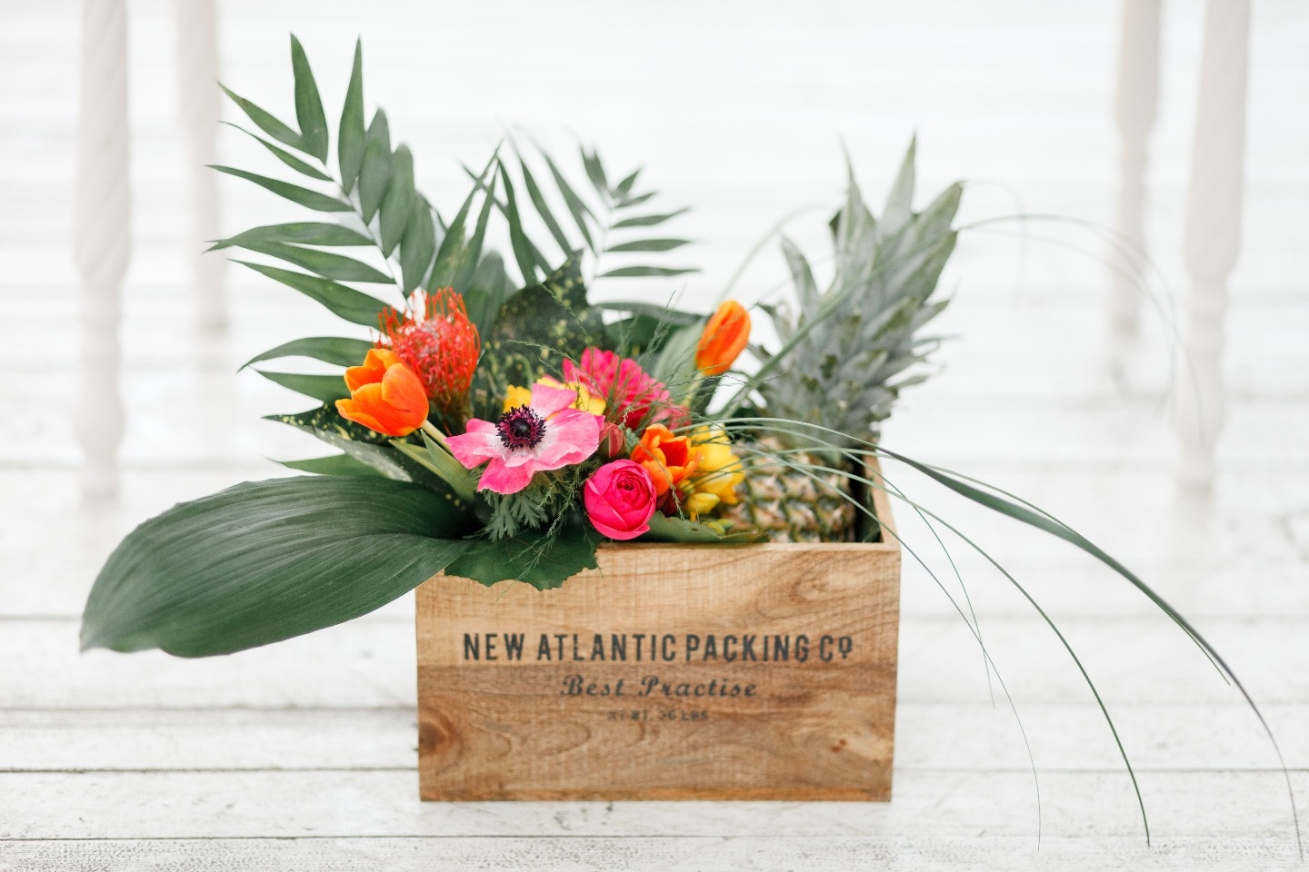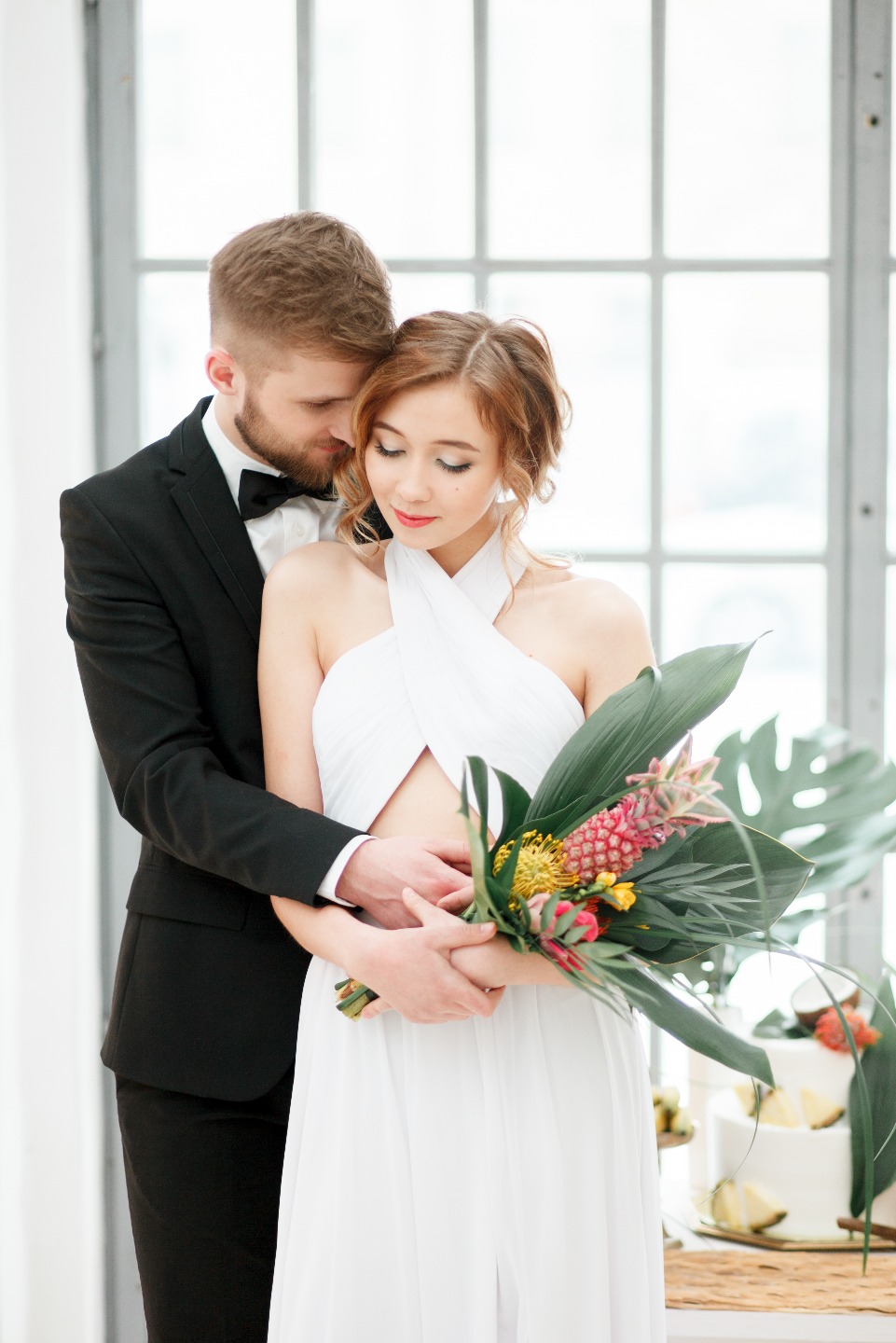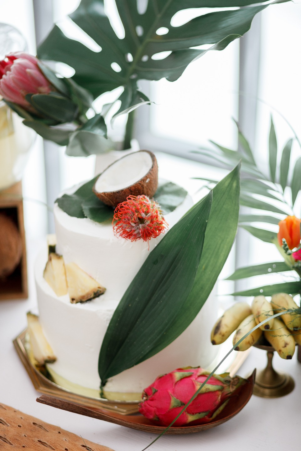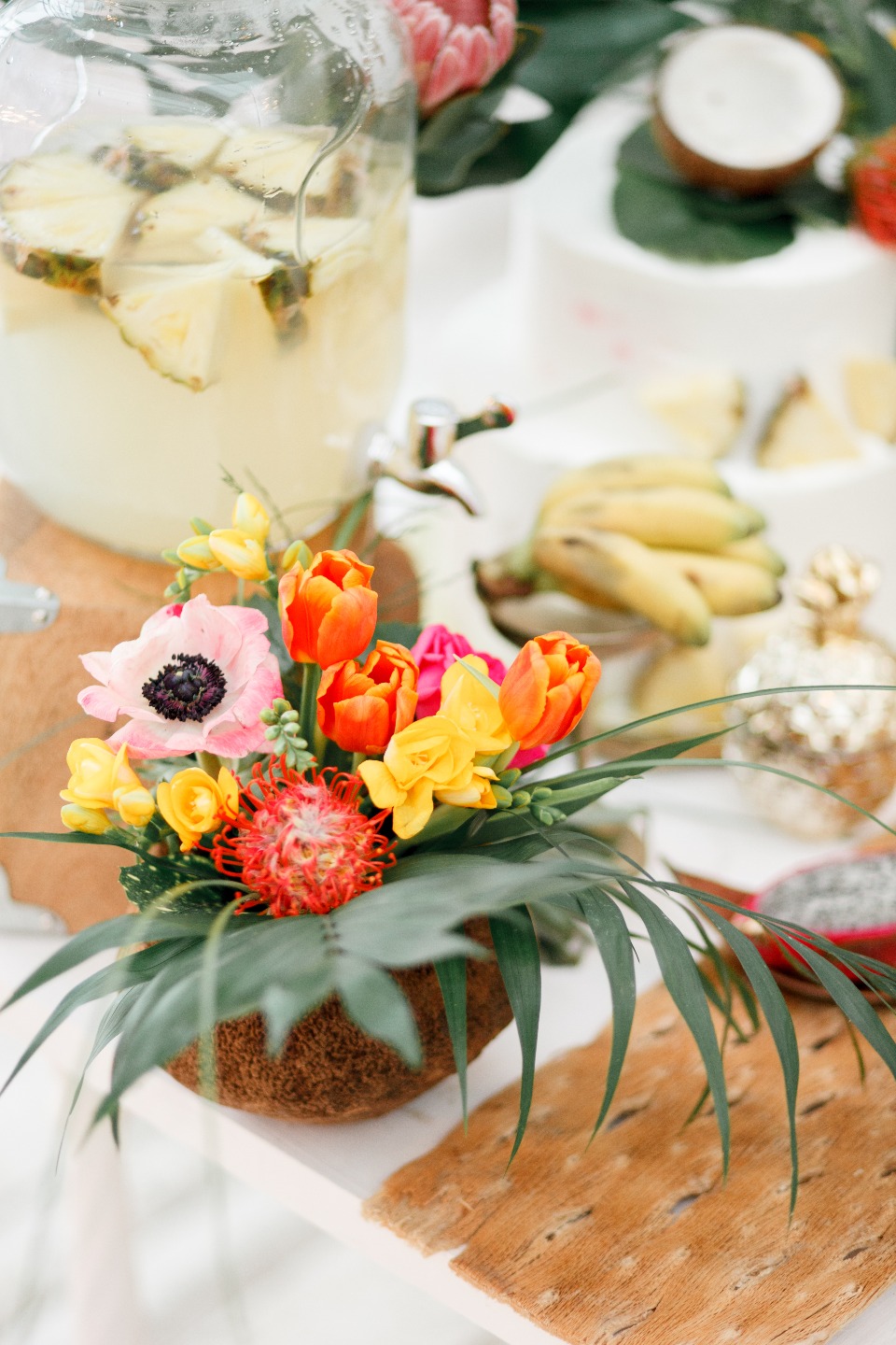 Всю зиму мы мечтали о чем-то ярком, концепция тропической свадьбы не покидала наши мысли, и вот, наконец, мы решились. В нашей палитре много белого, который контрастирует с яркими и насыщенными желтым, оранжевым и розовым, оттененными тропической зеленью. Основными акцентами стали яркие цветы и фрукты, обилие разнообразных фактур — дерево, стекло, металл, нежные лепестки цветов, плотные листья, интересные текстуры фруктов, а также контраст строгих форм посуды с хаотичностью флористических композиций.