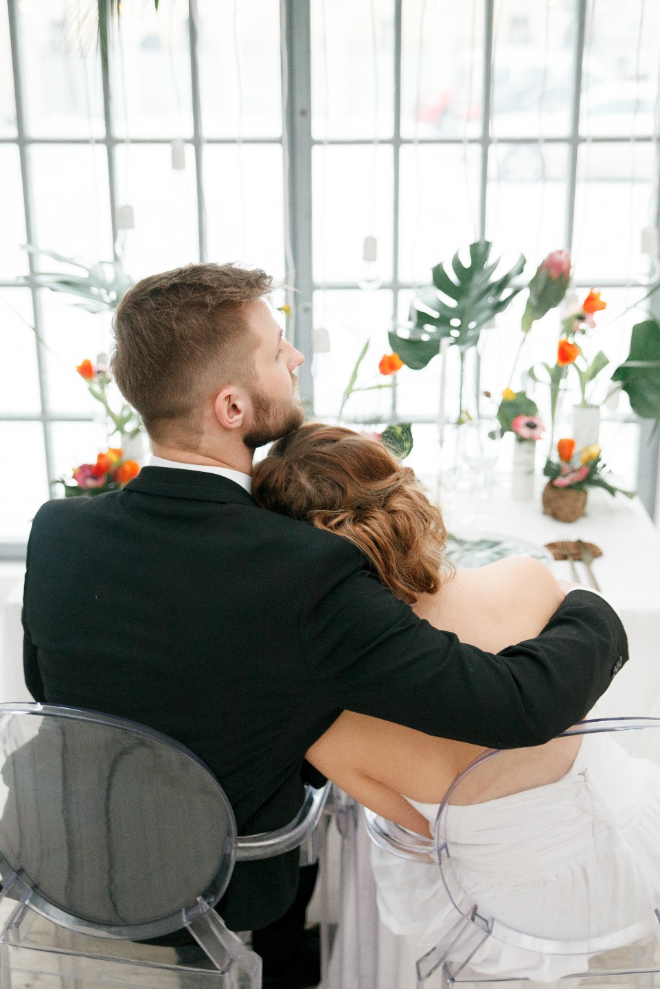 Для того, чтобы отразить настроение города, мы выбрали минималистичный интерьер, стекло и металл. Вазы разной формы и высоты расставлены несимметрично, передавая очертания городского пейзажа. Светлый фон наполнен зеленью и яркими цветами, которые передают атмосферу и яркую энергетику джунглей. Это история о современной молодой и креативной паре, которая не боится экспериментов.