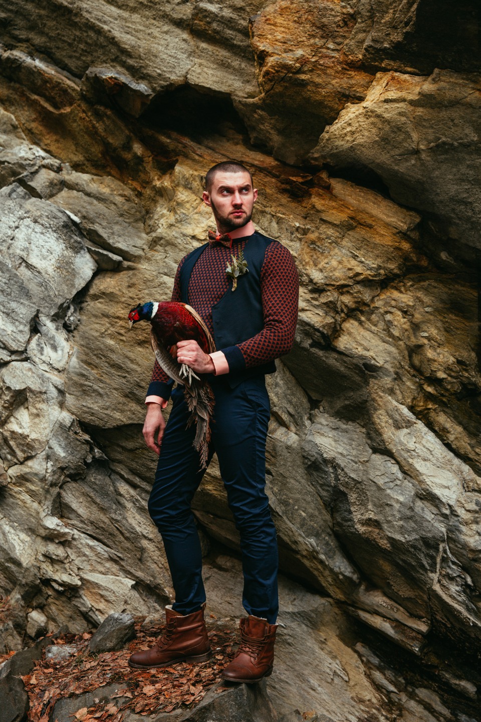В сегодняшней съемке место и пара невероятно гармонично подходят друг другу, а каждая деталь как будто специально создана для этих кадров: фактурные скалы, перья, кожа и даже фазан — все слилось в волшебную картинку.