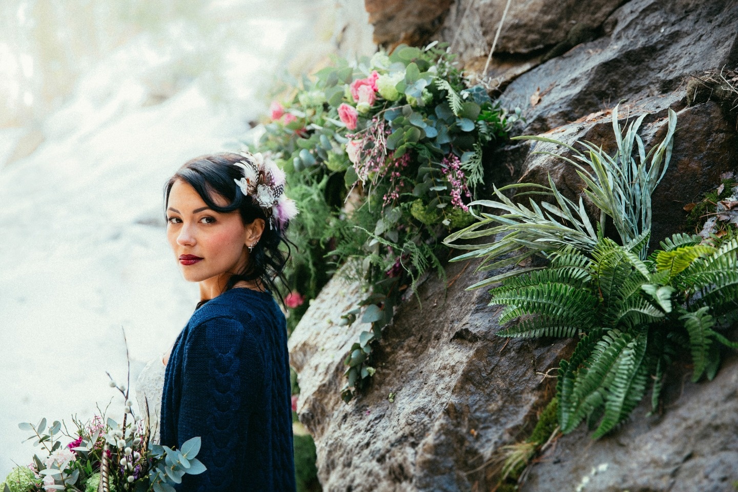 Мне кажется, скалистый пейзаж выбранного места как нельзя лучше гармонирует со жгучей, темпераментной красотой невесты и брутальным, мужественным обликом жениха. Насыщенные винные, коричневые и синие оттенки в одежде жениха и невесты, перья диких птиц, охотничья шляпа, стильные грубые сапоги — минимум «ванили», максимум свободы и смелости.