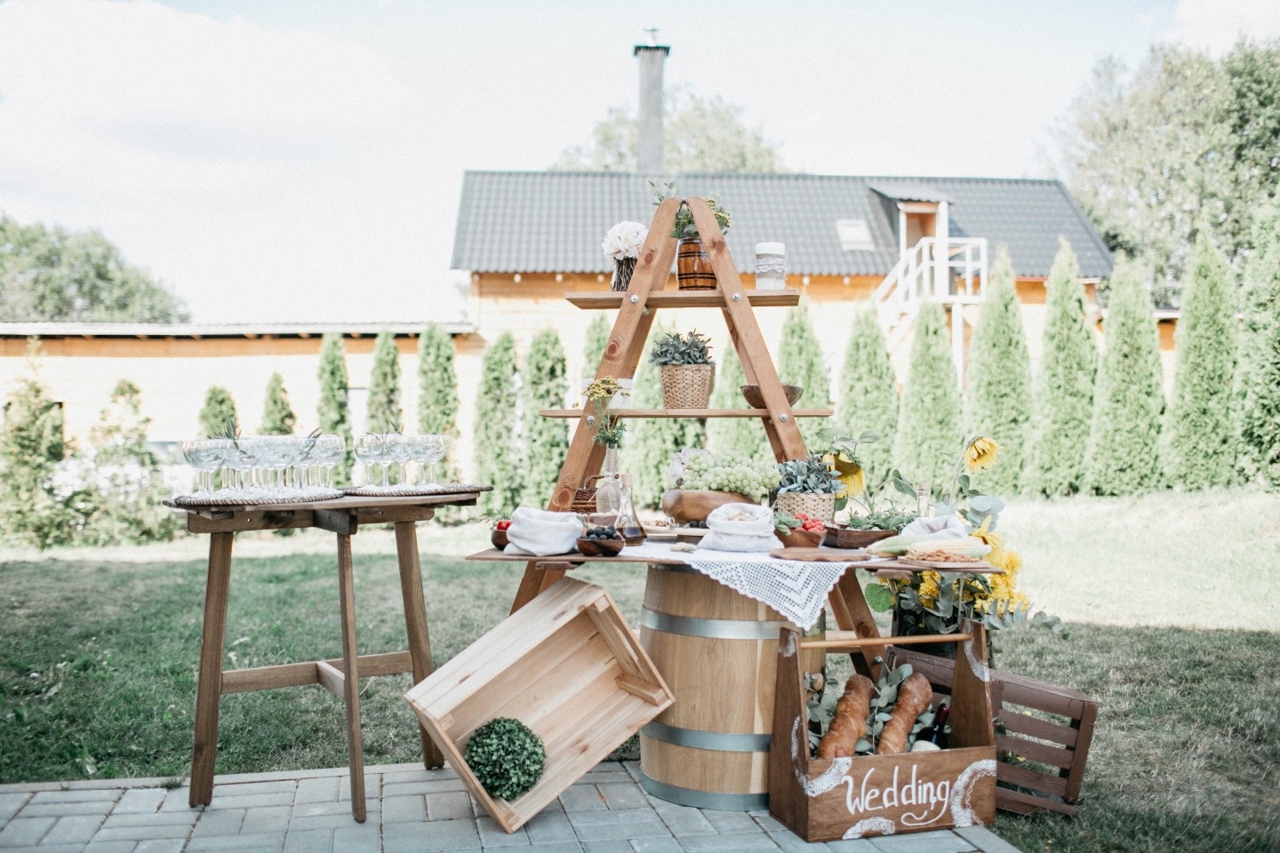 Эти же тона поддерживались и во флористике: было очень много лаванды, всевозможной зелени, а ярким акцентом стали цветы подсолнуха и желтые скворечники на деревянной ширме на выездной регистрации. В оформлении хотелось максимальной простоты: только природа, естественная красота и легкость линий.
