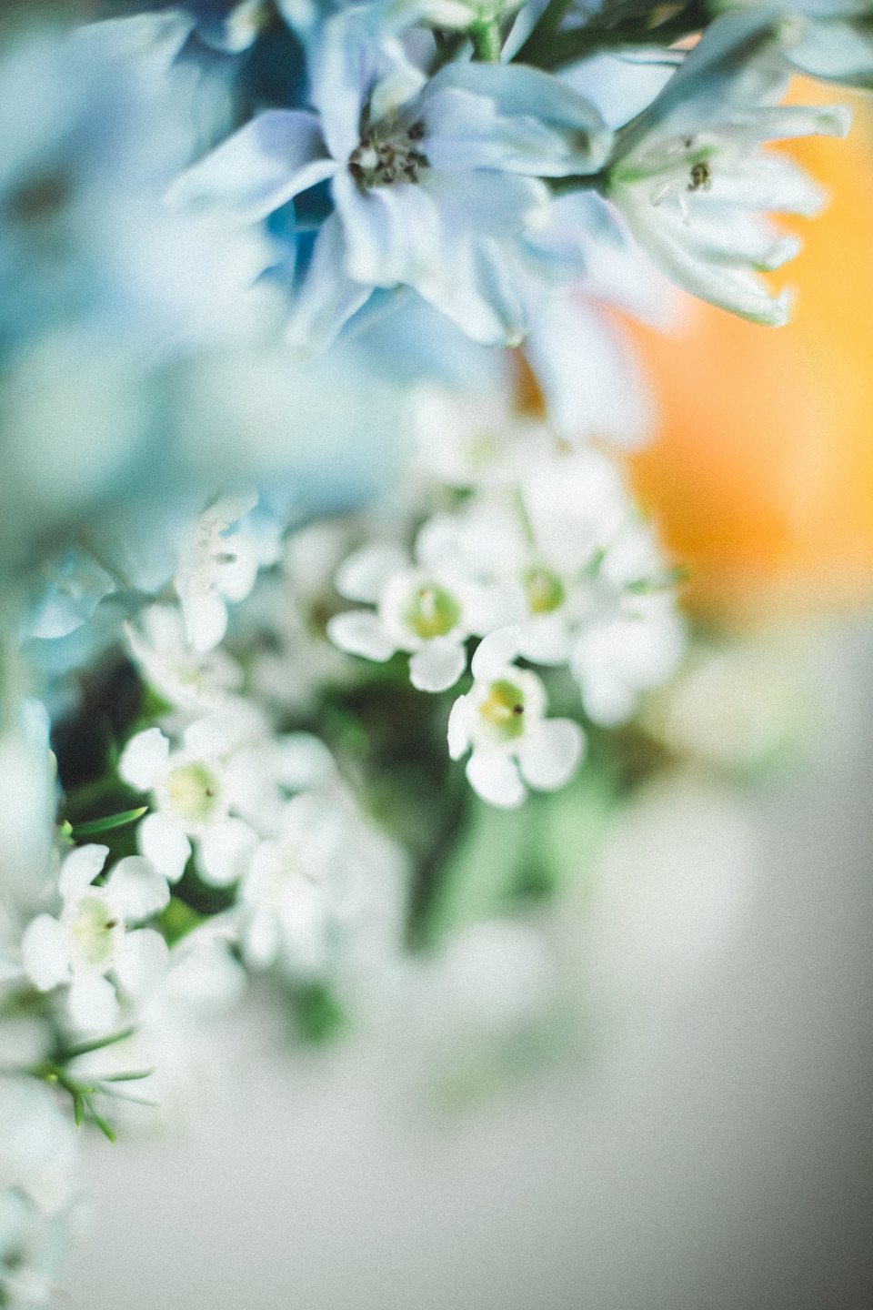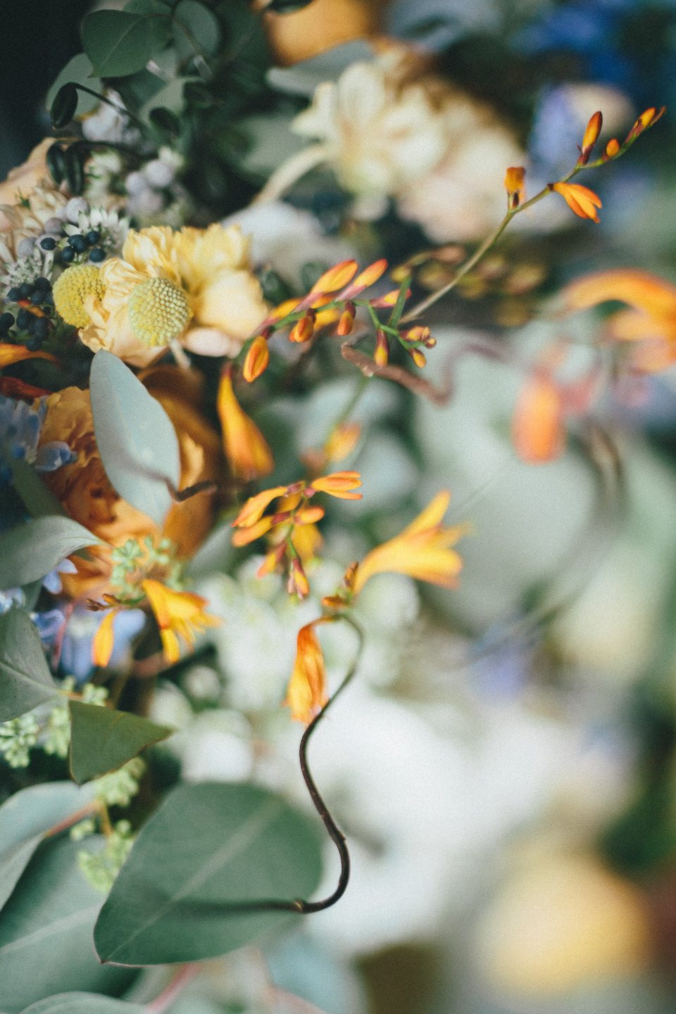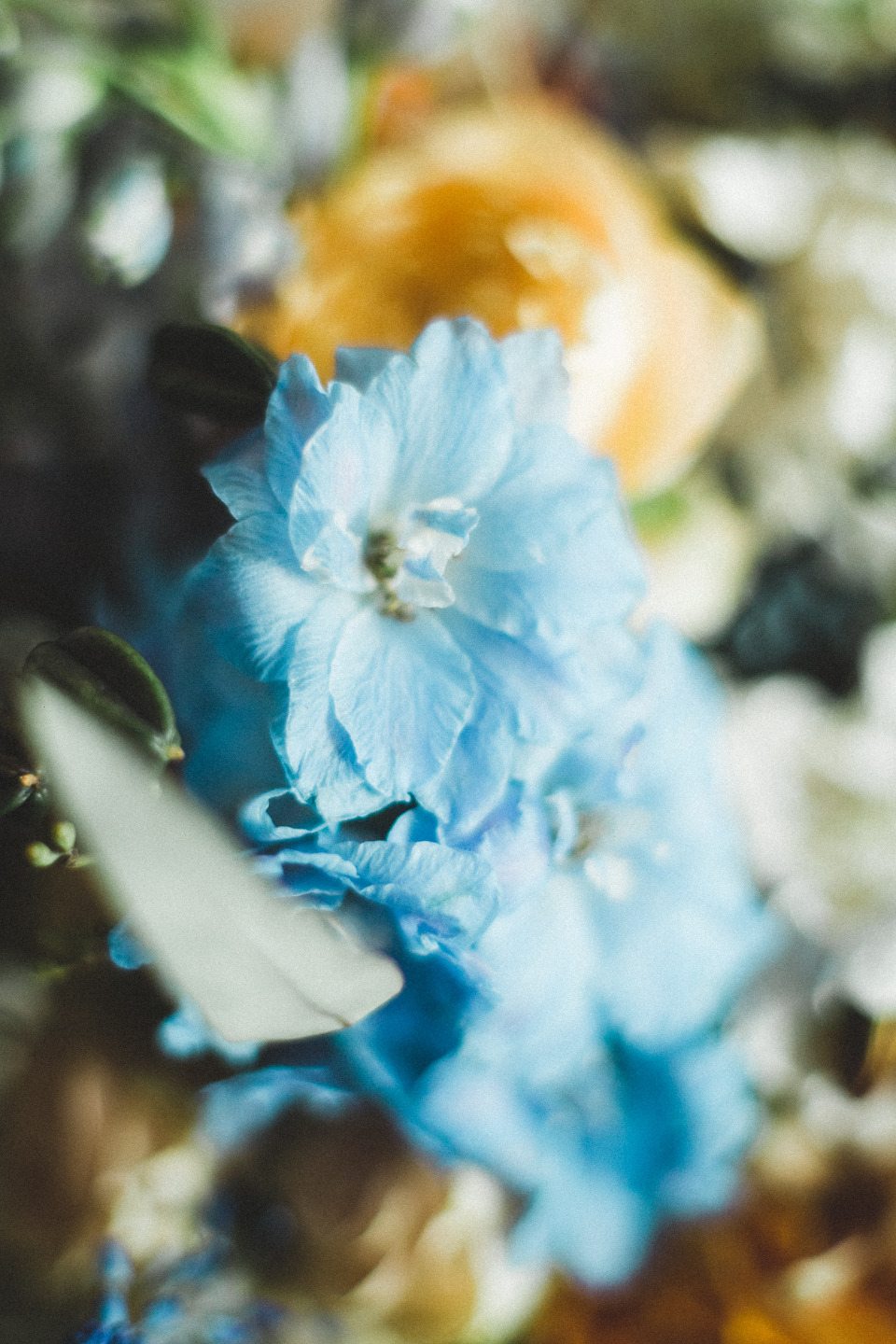 Композиция состояла из пионовидных махровых желтых роз сорта вувузела и хризантем благородного пудрового оттенка. Их мы дополнили нежнейшим голубым дельфиниумом и космическими мускари-блю, глубины букету придал черный агапантус с семенами и ягоды вибурнума, а фоном послужила белая гортензия и кустовая кремовая роза. Тщательно подобранная насыщенность и температура оттенков сыграли решающую роль в благородном звучании всей композиции.