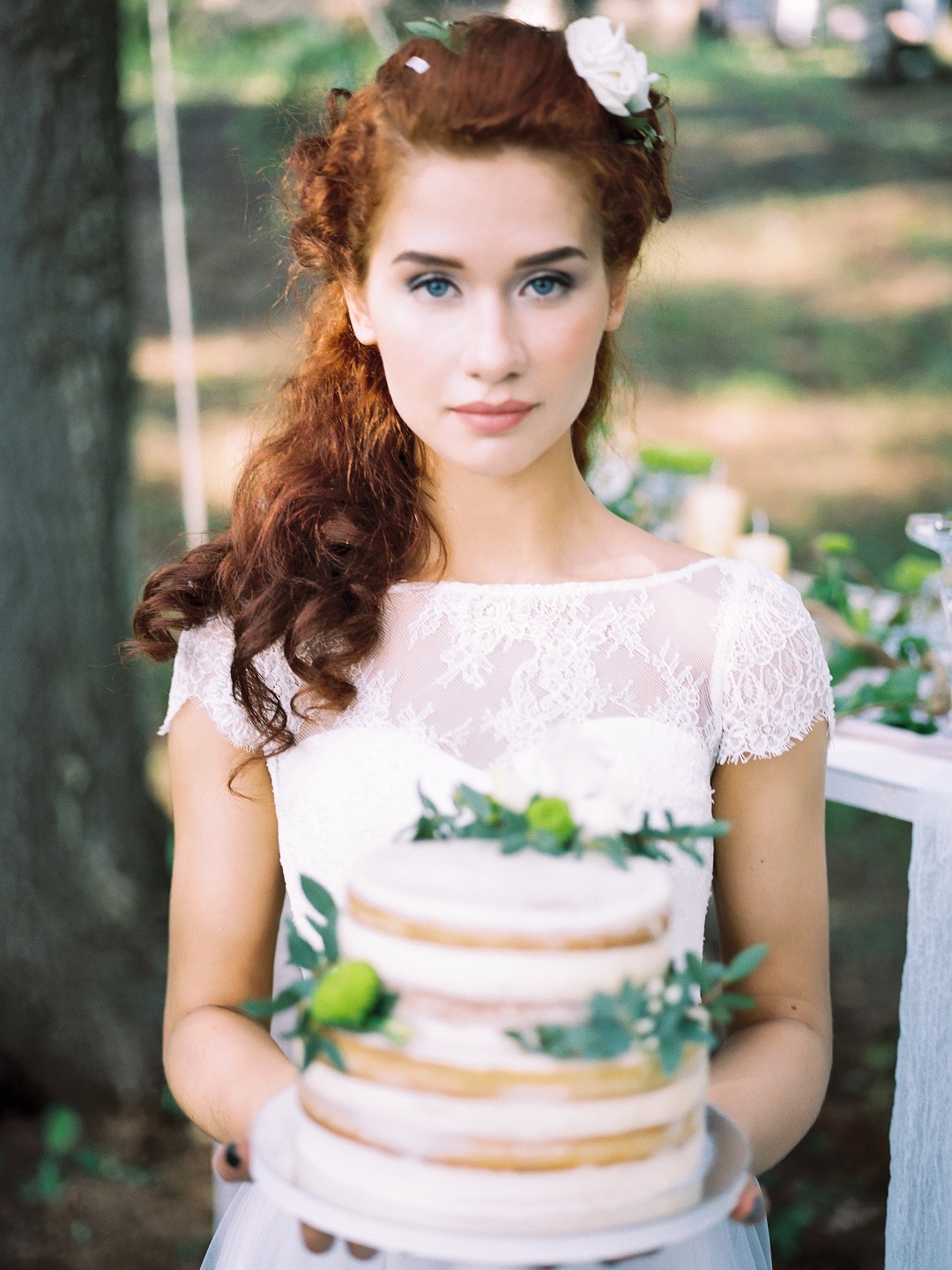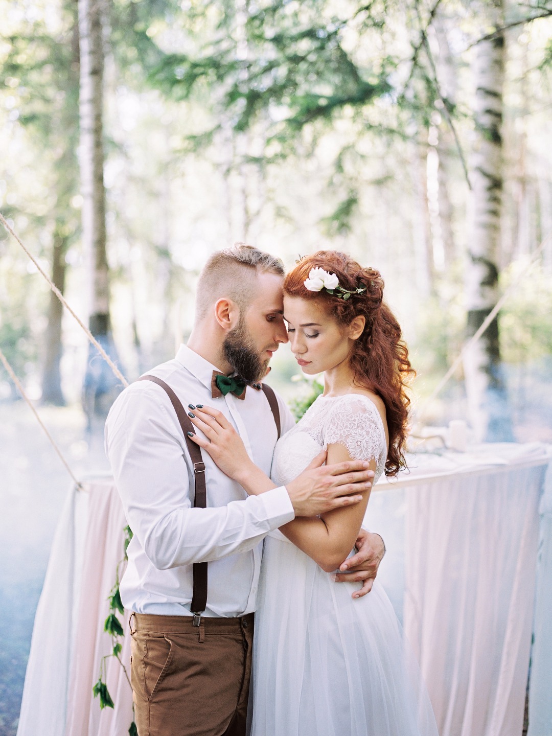 Стиль Botanical в оформлении диктует простые сочетания красок (белый, бежевый, все оттенки зелени), а также легкие струящиеся ткани и много-много цветов. Крутые холмы, поросшие папоротником и лесными ландышами, — более подходящую локацию для такой съемки сложно было придумать!