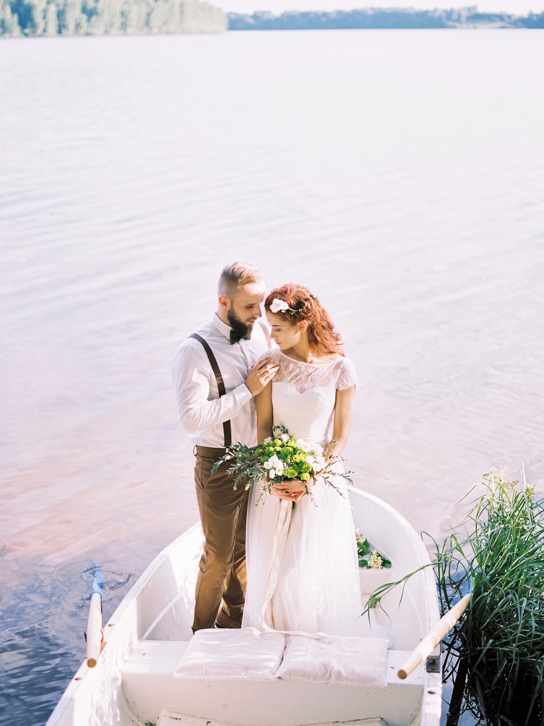 Получилась свадьба из грез: волшебное утро невесты на природе, проведенное под пение птиц; встреча влюбленных и клятвы под сенью деревьев; романтическое свидание для двоих и, наконец, прогулка на лодке — как символ путешествия в новую семейную жизнь, полную счастливых открытий!
