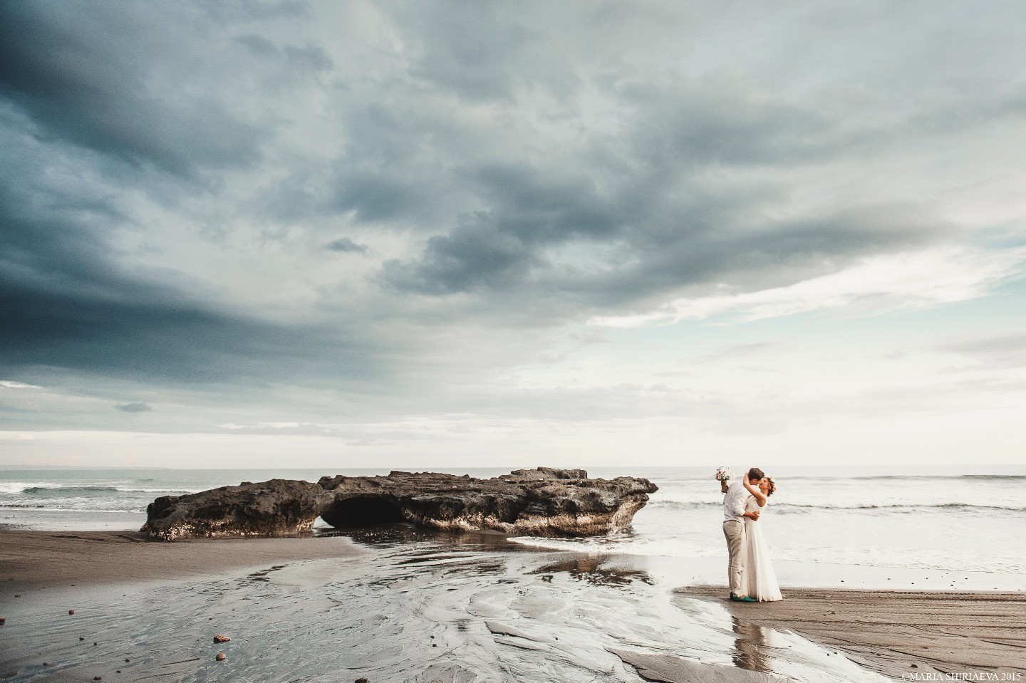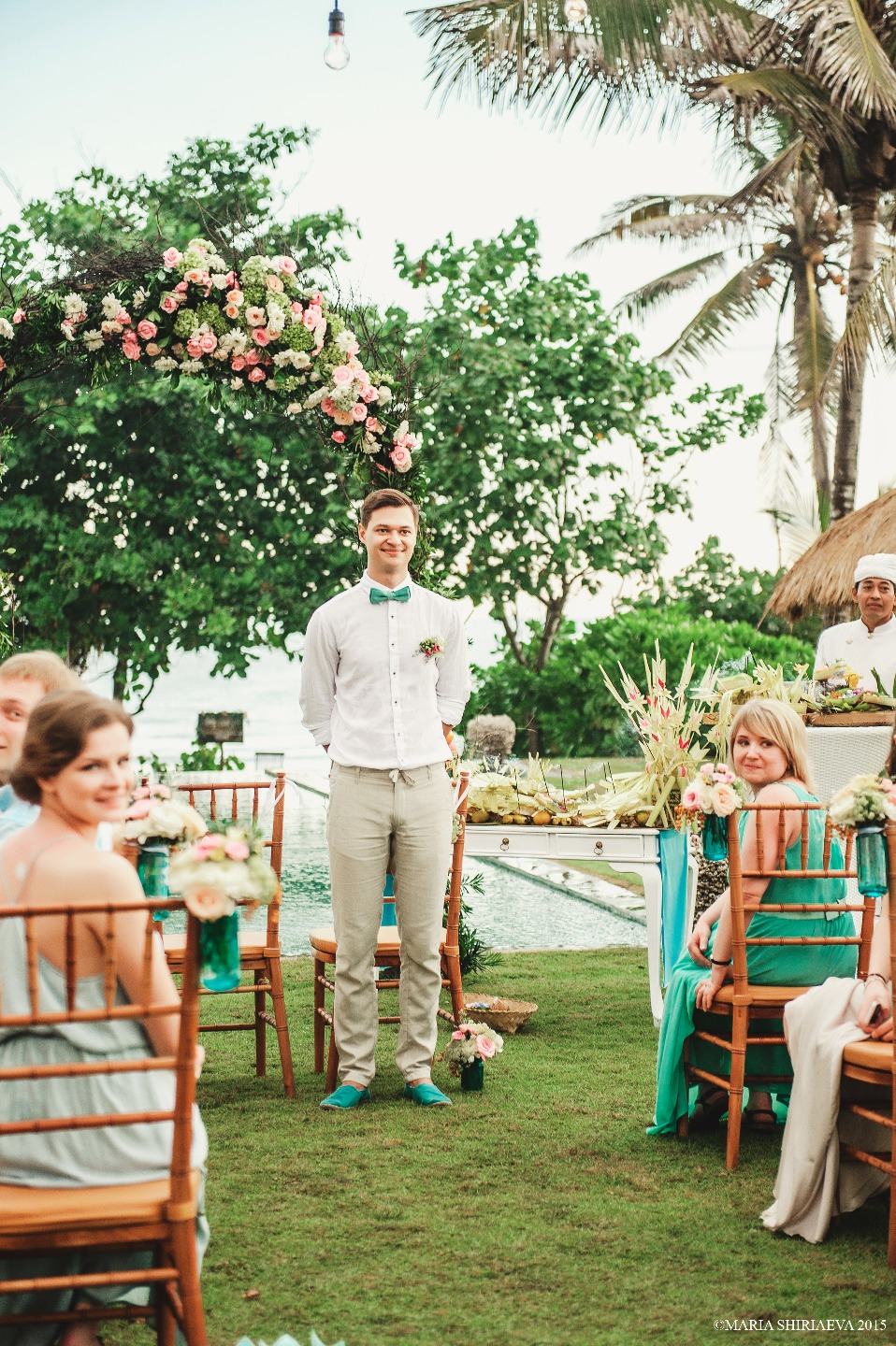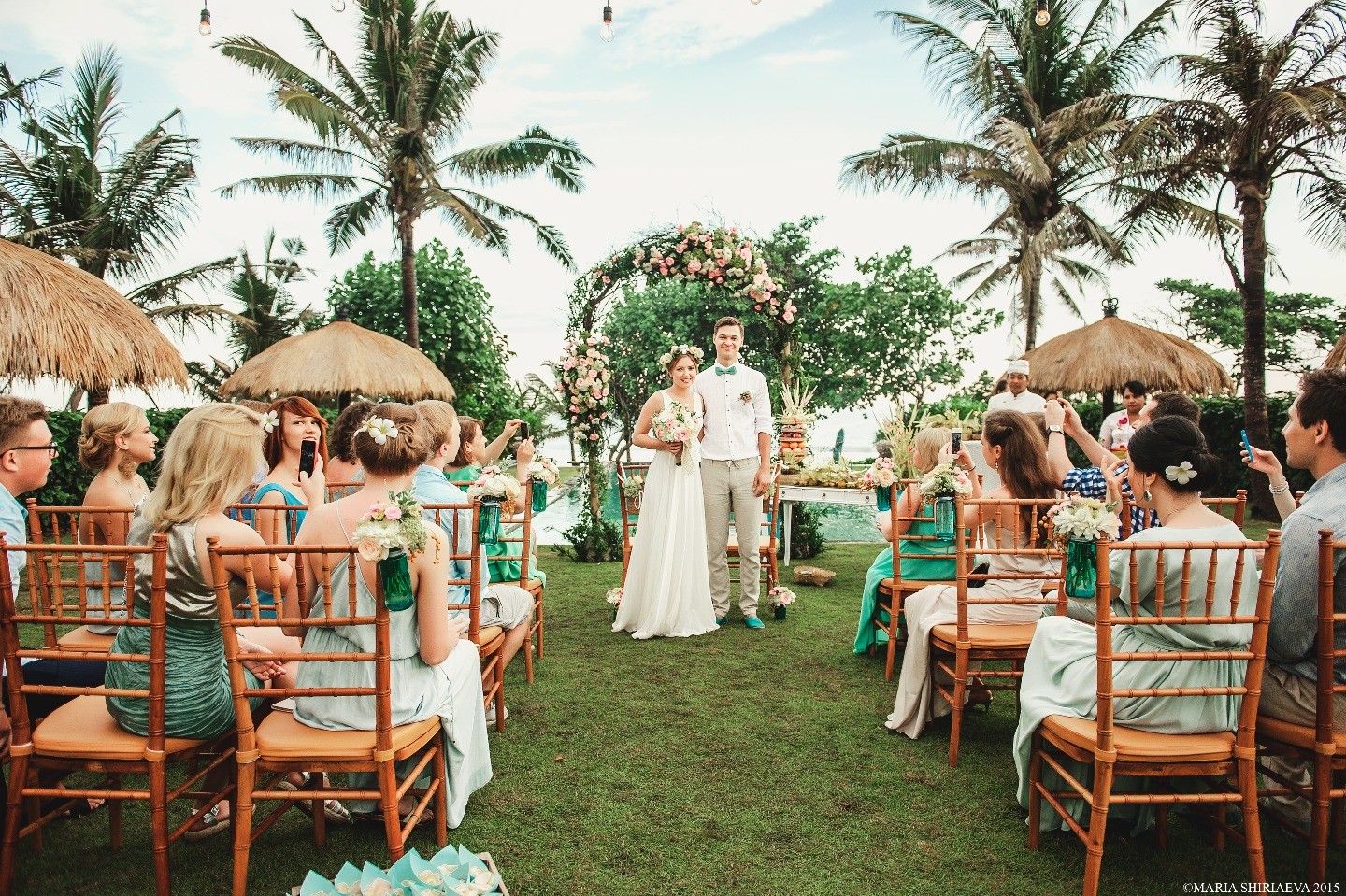 Свадьбу начали планировать практически сразу после возвращения в Москву. Мы стараемся много путешествовать и влюблены в океан и серфинг, поэтому тайно мечтали о свадьбе на острове Бали, где до этого побывали уже 4 раза! Сначала у нас было множество сомнений: выйдет дорого, гости не смогут приехать, мы не найдем хороших подрядчиков, но первые расчеты показали, что, возможно, свадьба на Бали — это наиболее бюджетный вариант из всех. Так что мы выбрали дату — конец апреля (перед майскими праздниками, чтобы все гости смогли приехать) и приступили к планированию. Более того, совершенно случайно вышло так, что один наш знакомых и его жена, живущие на Бали, имеют связи в свадебном бизнесе, поэтому ребята помогли нам во всем: от выбора места проведения до заказа текстиля нужного нам цвета.