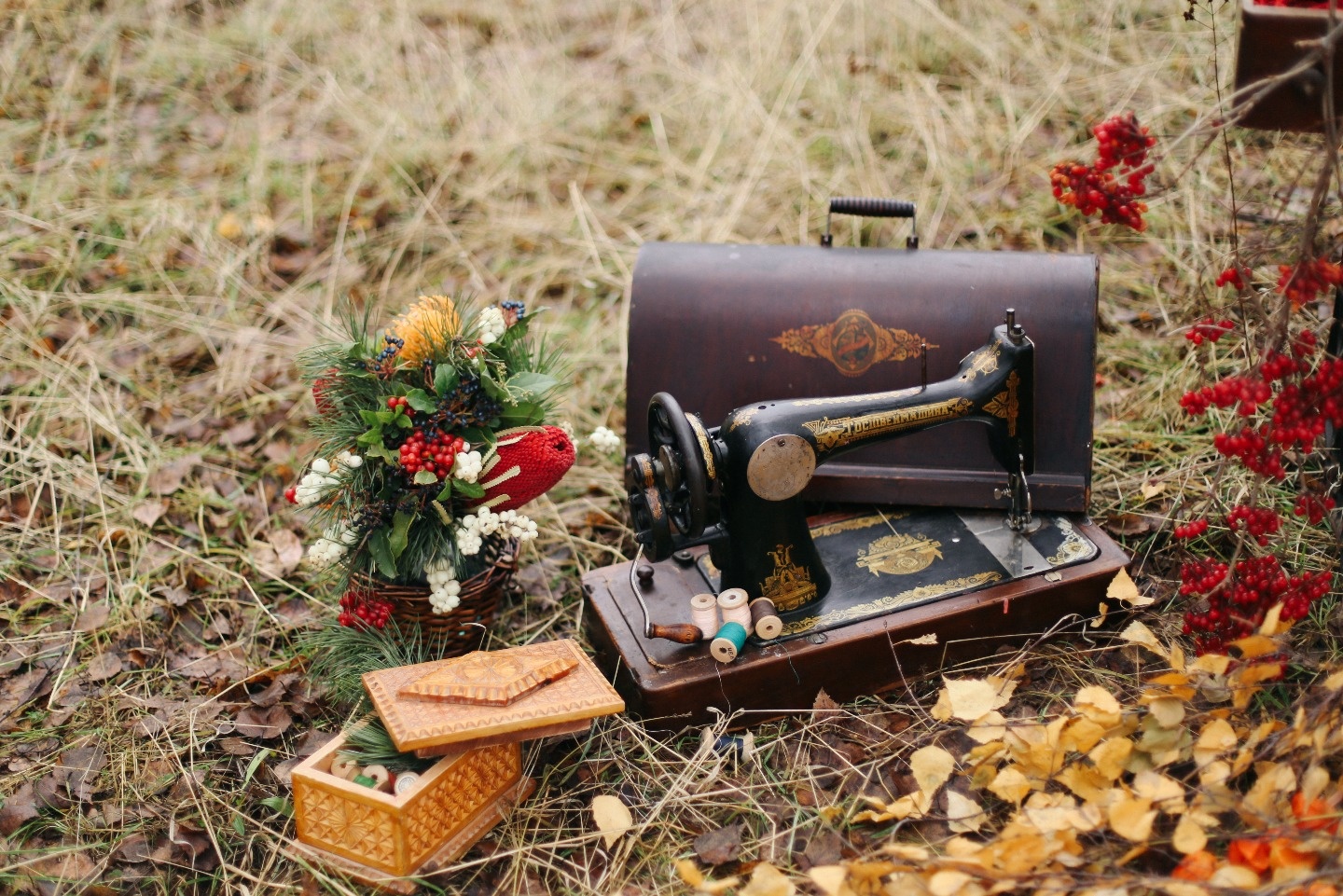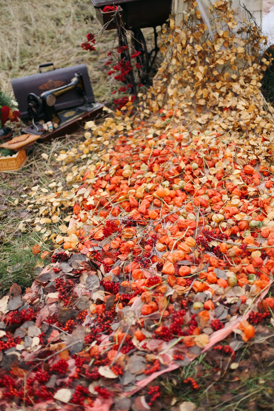 Мы не хотели подчинять эту творческую съемку определенной стилистике, не хотели границ и рамок. Вся сюжетная линия складывалась сама собой, перетекая от одного элемента декора в другой. Особую атмосферу создавали вещи из прошлых столетий — например, старинная швейная машинка, на которой неспешно, с особым трепетом наша осенняя нимфа шила полотно, собранное из самых ярких листьев, цветов и ягод.