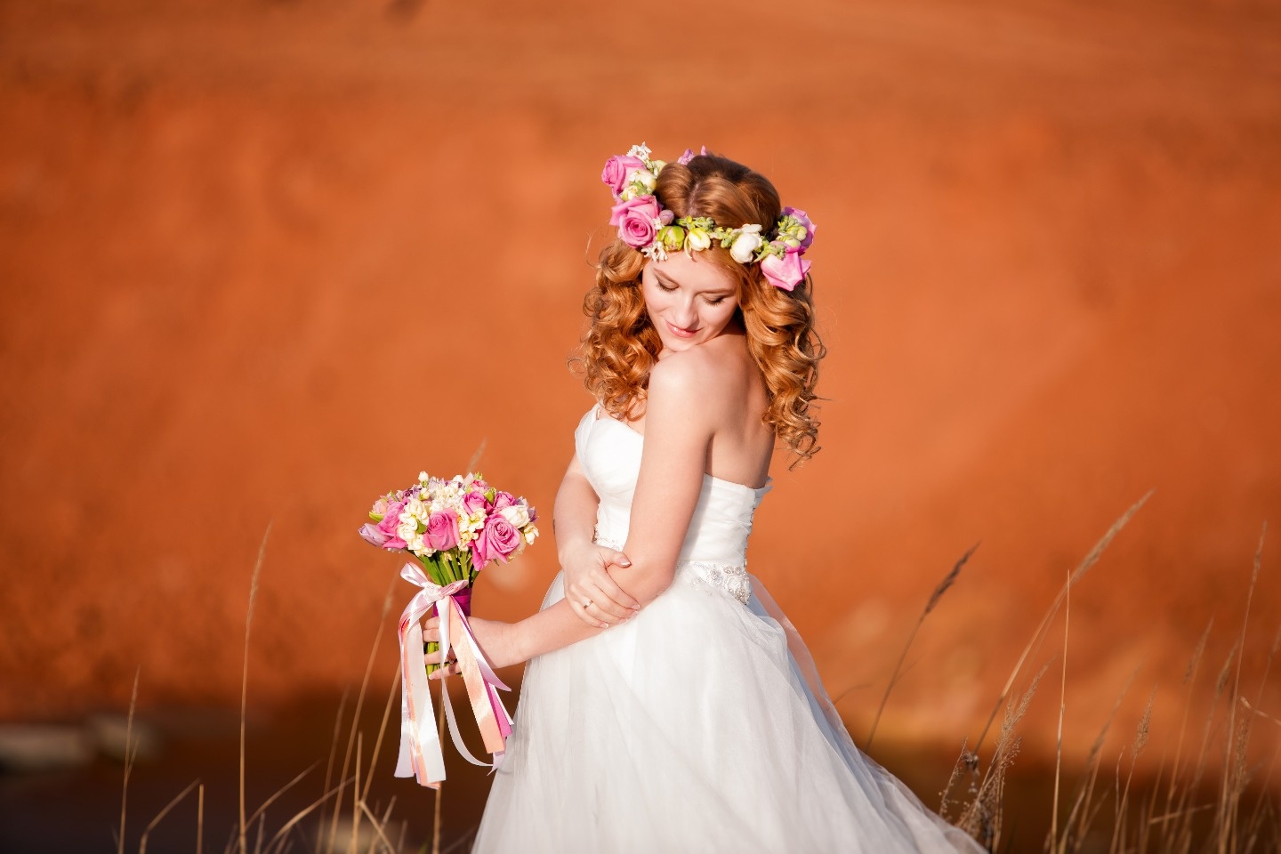 Планируя эту съемку мы пытались объединить два абсолютно разных стиля: помпезность и вычурность классической свадьбы, ярко выраженные в сборах невесты, и основные элементы стиля «эко», которые мы использовали в деталях оформления свадебной церемонии. Но самым главным акцентом съемки было место. Оно уникально по своей цветовой палитре и атмосфере. А закат лишь подчеркнул основной цвет съемки — ярко-оранжевый.