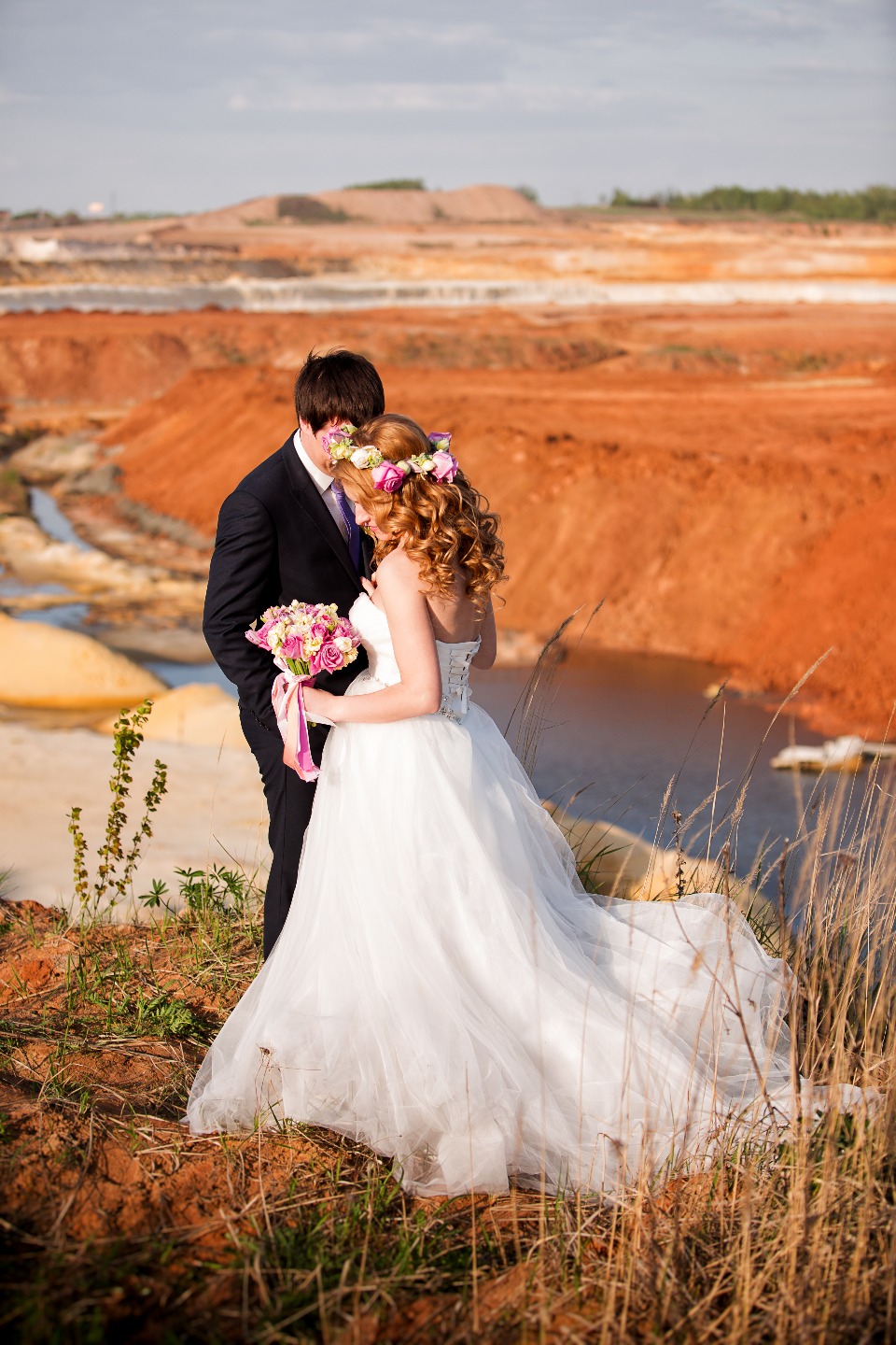 Увидев невесту, я сразу поняла, что это будет великолепная съемка. А прекрасные и нежные сборы на фоне Москва-Сити свели меня с ума! Затвор моего фотоаппарата щелкал с невероятной быстротой. Я не могла насытиться прекрасными кадрами, которые видела сквозь видоискатель. А приехав на место церемонии, я так и ахнула от восторга! Невероятно красивые песчаные горы: то ли я очутилась в Гранд каньоне, то ли нахожусь посреди марсианского плато. Время для церемонии выбрали самое подходящее для этого места — закат. Каждую минуту солнце окрашивало песок в разные цвета, и фотосессия становилась все романтичнее и прекраснее!