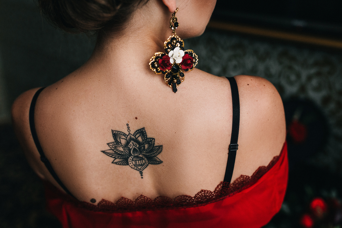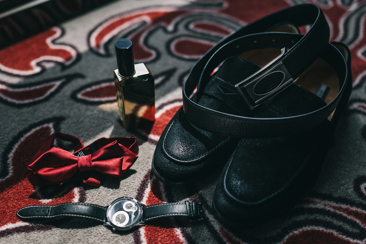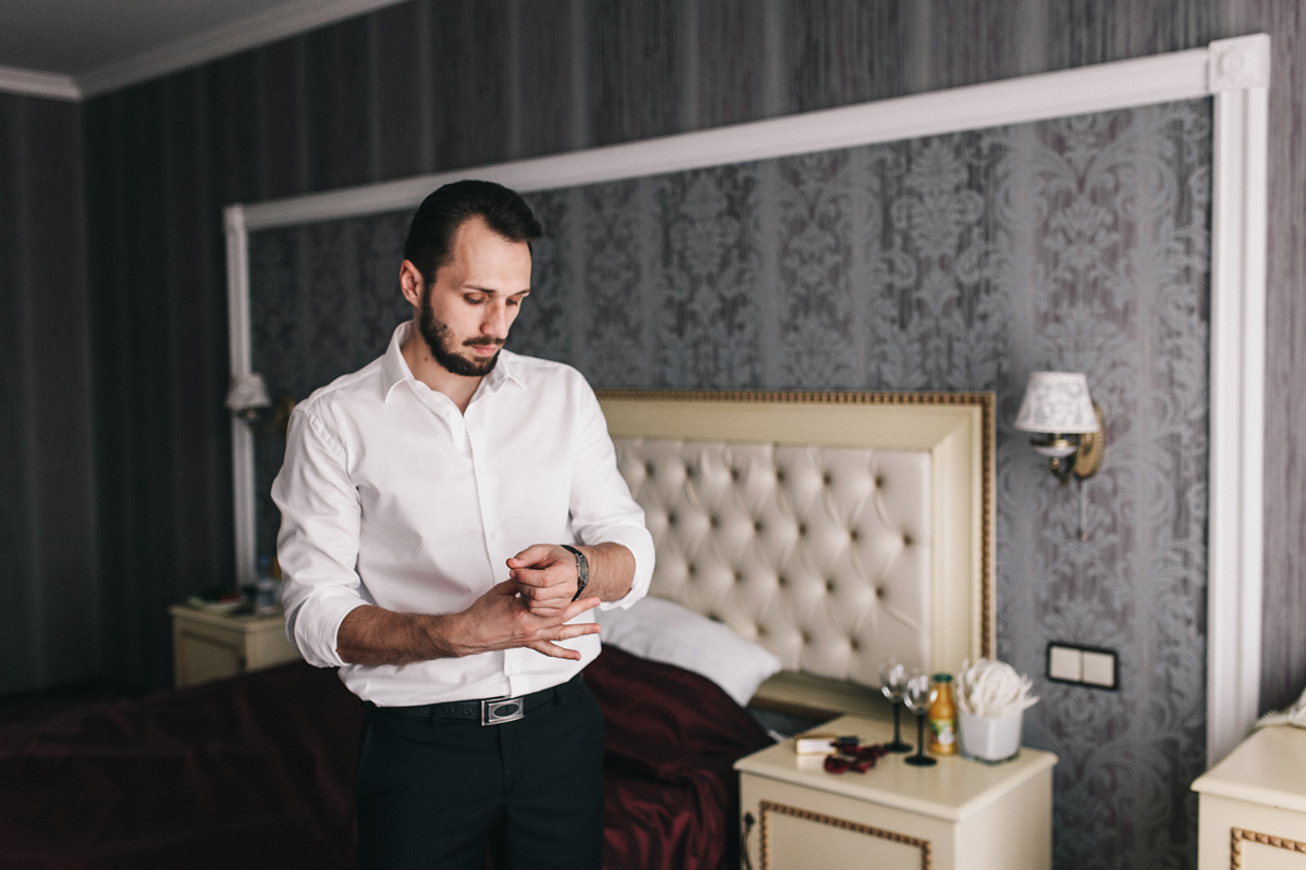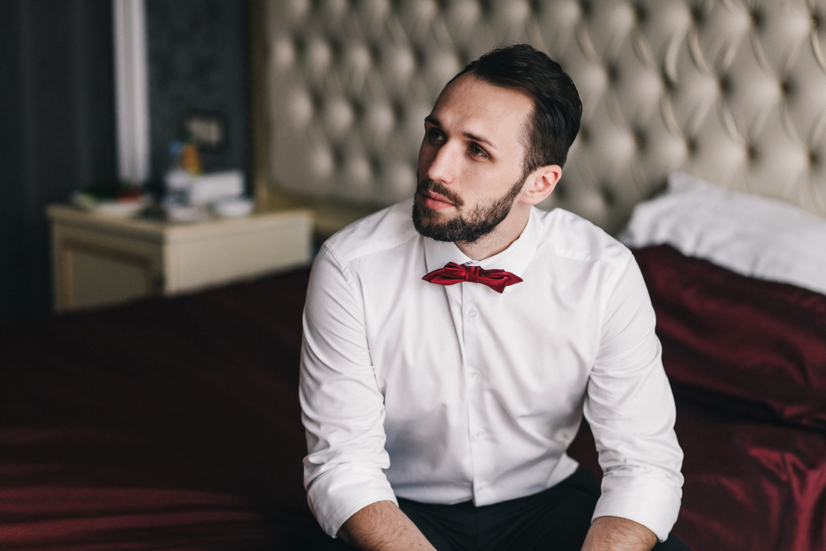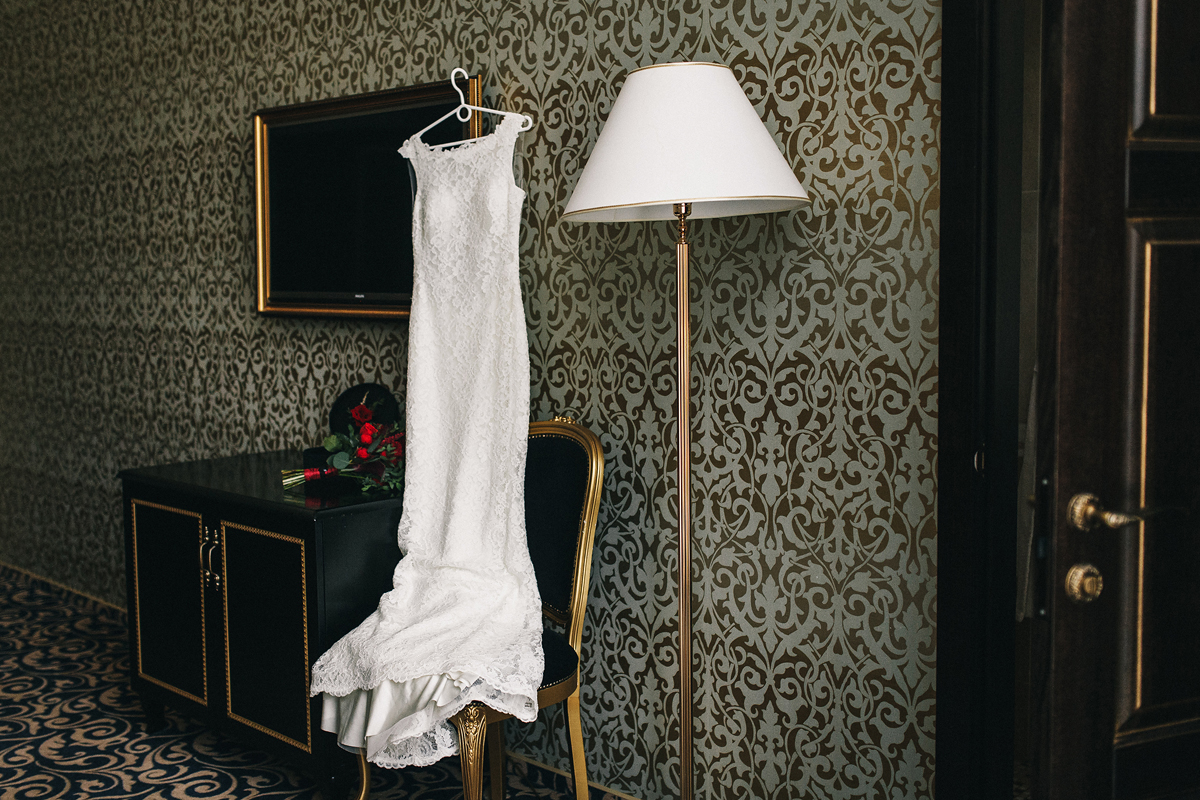 Цветовая палитра: насыщенный марсала с оттенками красного, пурпурного, матовой зелени. Золотые детали — канделябры, окантовки мебели — добавляли шика. Мы внимательно отнеслись ко внешнему виду жениха и невесты. Михаил был без пиджака, только бабочка, брюки. Платье невесты выбрали по фигуре — красивое плотное кружево, открытая спинка, показали татуировку на спинке.