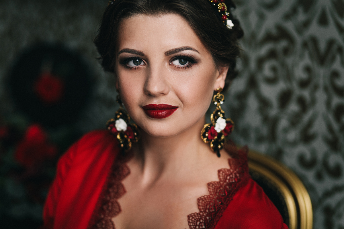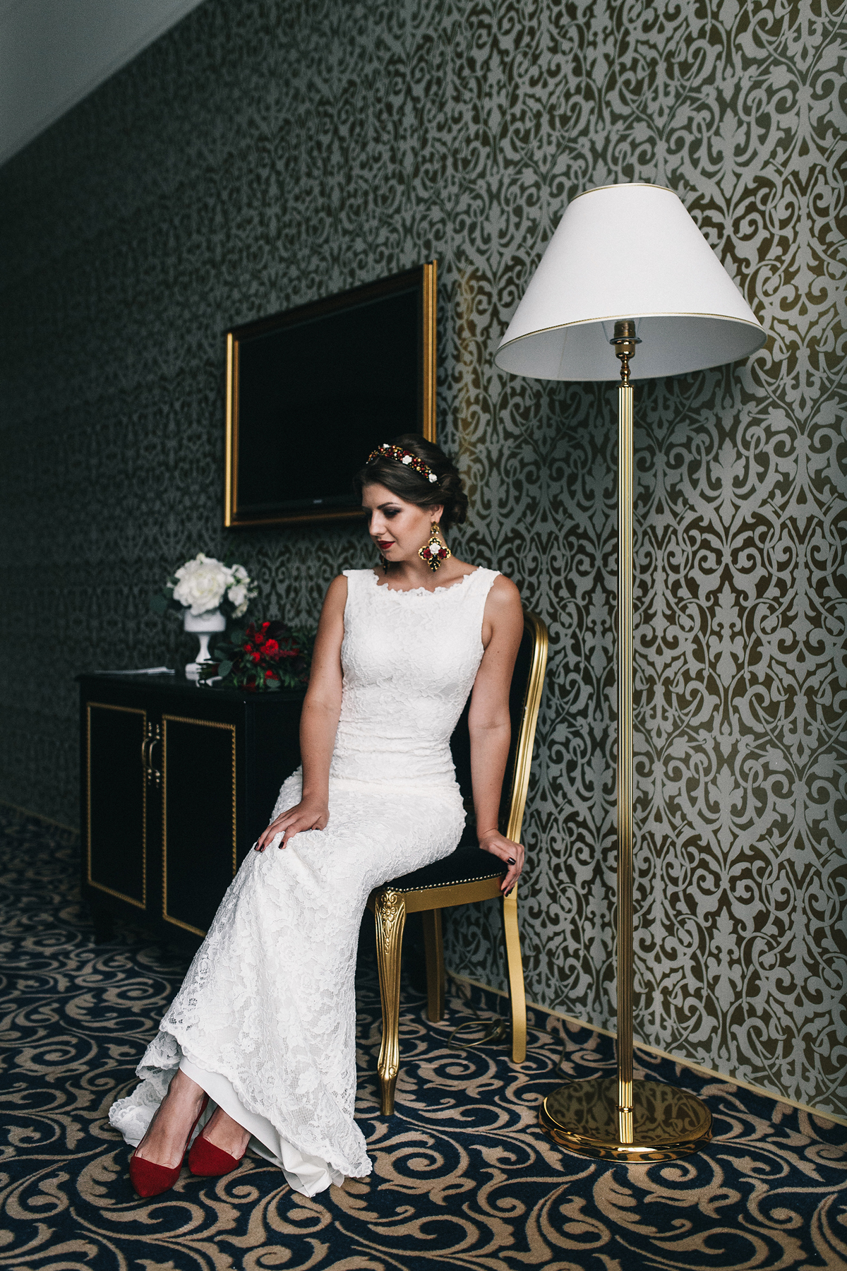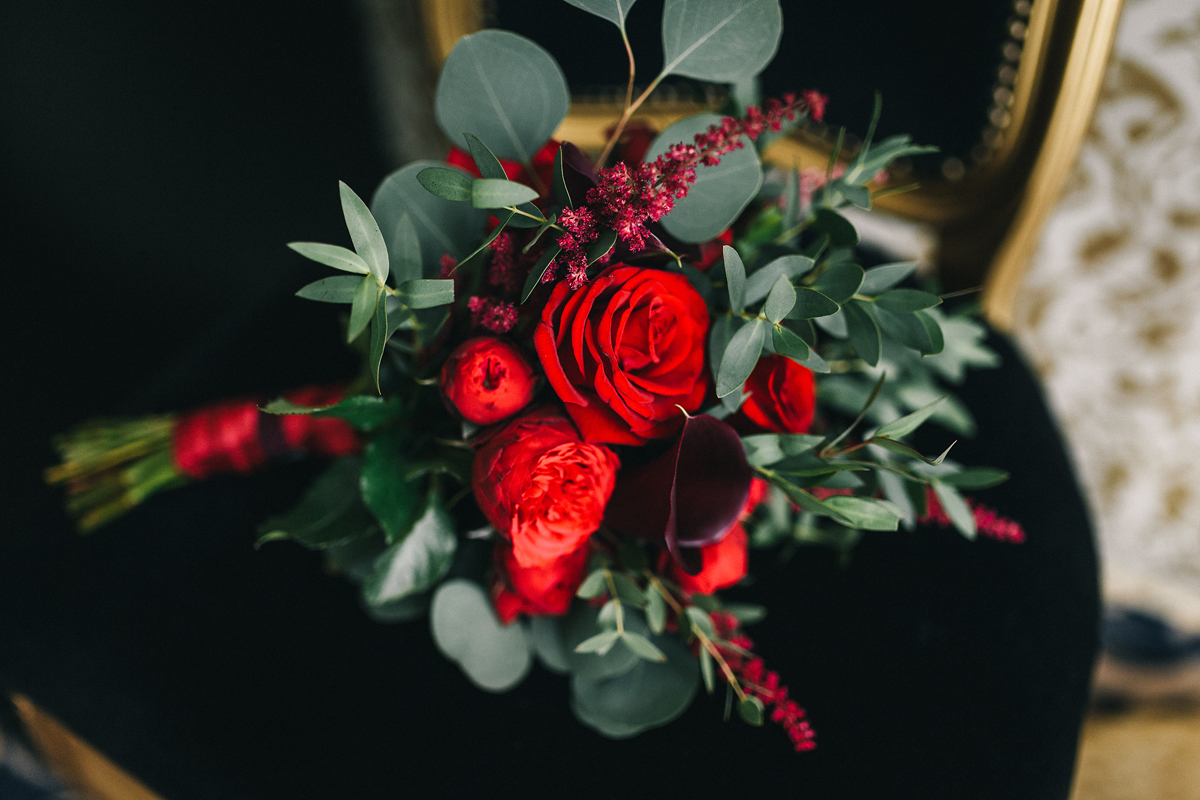 И главный акцент: крупные аксессуары, ободок и серьги ручной работы с винными, золотыми, белыми и черными оттенками. Главную роль в букете невесты играла кустовая роза пиано фриланд, дополняли её пурпурные каллы, обрамляла матовая зелень эвкалипта парвифолия, утонченность и женственность добавила астильба. Для фотографий букета использовали черный бархатный стул.