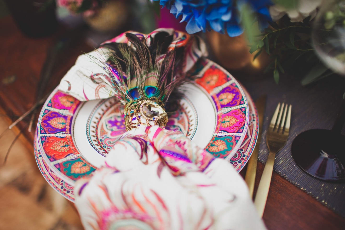 За основу мы взяли этнические мотивы цыганской палитры с элементами древнеиндейских народностей — разнообразными перьями и ловцами снов. Флористика базировалась на сочетании полевых цветов и зелени с яркими экзотическими цветами. В полиграфии также прослеживалась идейная линия: перья павлина и яркая палитра на хлопковой бумаге ручной работы.