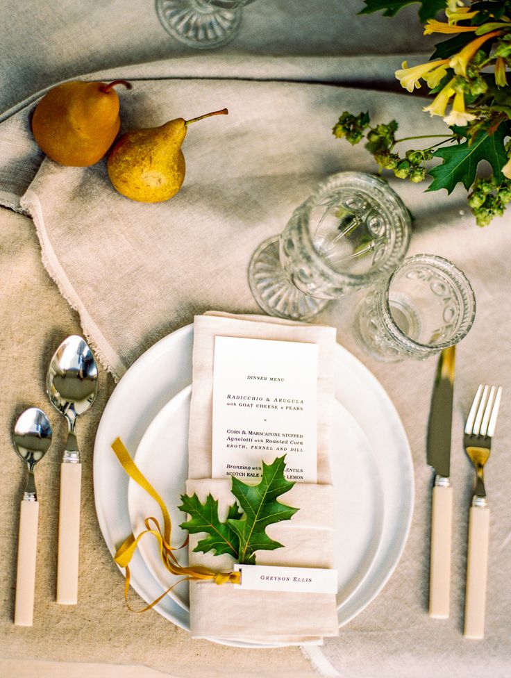 Следующий пункт полиграфии, о котором стоит подумать — меню. Не все пары решают включить его в сервировку, а зря! Стол преобразится до неузнаваемости, если на тарелках гостей появятся карточки с названиями блюд, что также будет весьма полезно для тех, кто внимательно следит за составом блюд, которые ест. Есть разные варианты, как разметить меню: на тарелке, на салфетке, внутри салфетки или более креативно: вместо подстановочной тарелки или в виде свертка рядом со столовыми приборами. Обрати внимание на общее правило: меню не должно быть по формату больше диаметра тарелки, иначе смотреться оно будет неуместно.