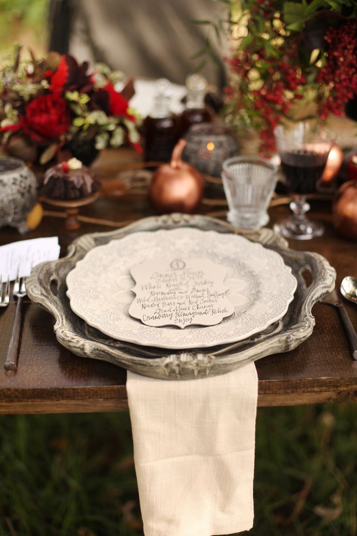Карточки рассадки или их замена — последний пункт полиграфии, дополняющий грамотную сервировку. Классические правила предполагают, что карточка лежит на уровне центра тарелки. Но ты можешь себе позволить отойти от этой традиции, например, разместить карточку на тарелке, повязать в виде бирки на столовые приборы или в виде небольшого свертка на бокал для вина. Карточки меняются и по внешнему виду: сейчас это не обязательно бумажный вариант — это и надписи на камнях, листьях, дереве и пр. Вместо карточек рассадки могут использоваться приветственные карточки или карточки благодарности, где написано «Добро пожаловать» или слова благодарности за то, что гости разделили с вами этот день.