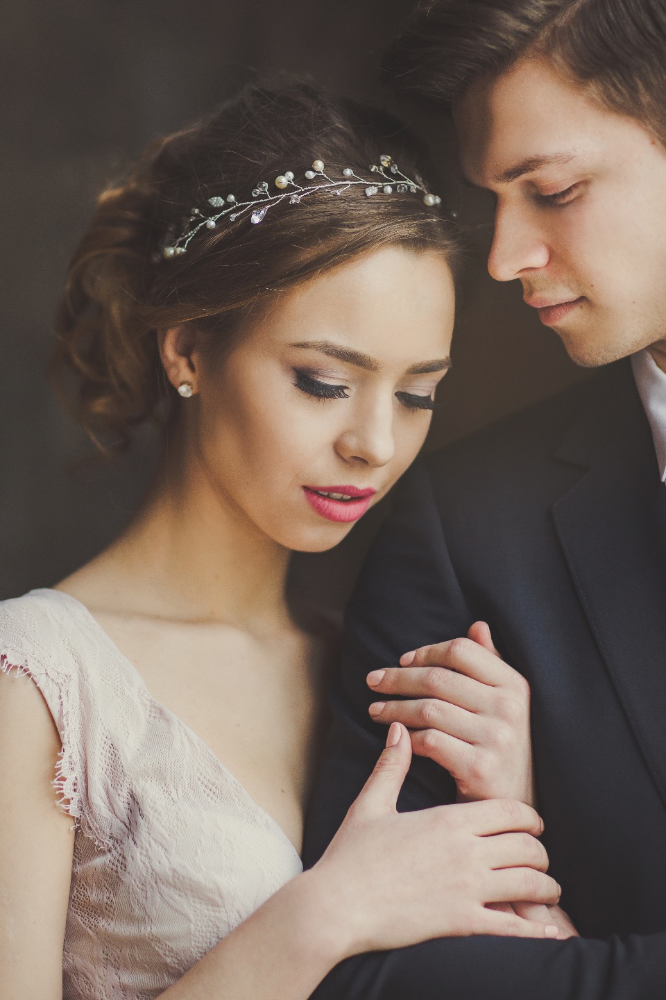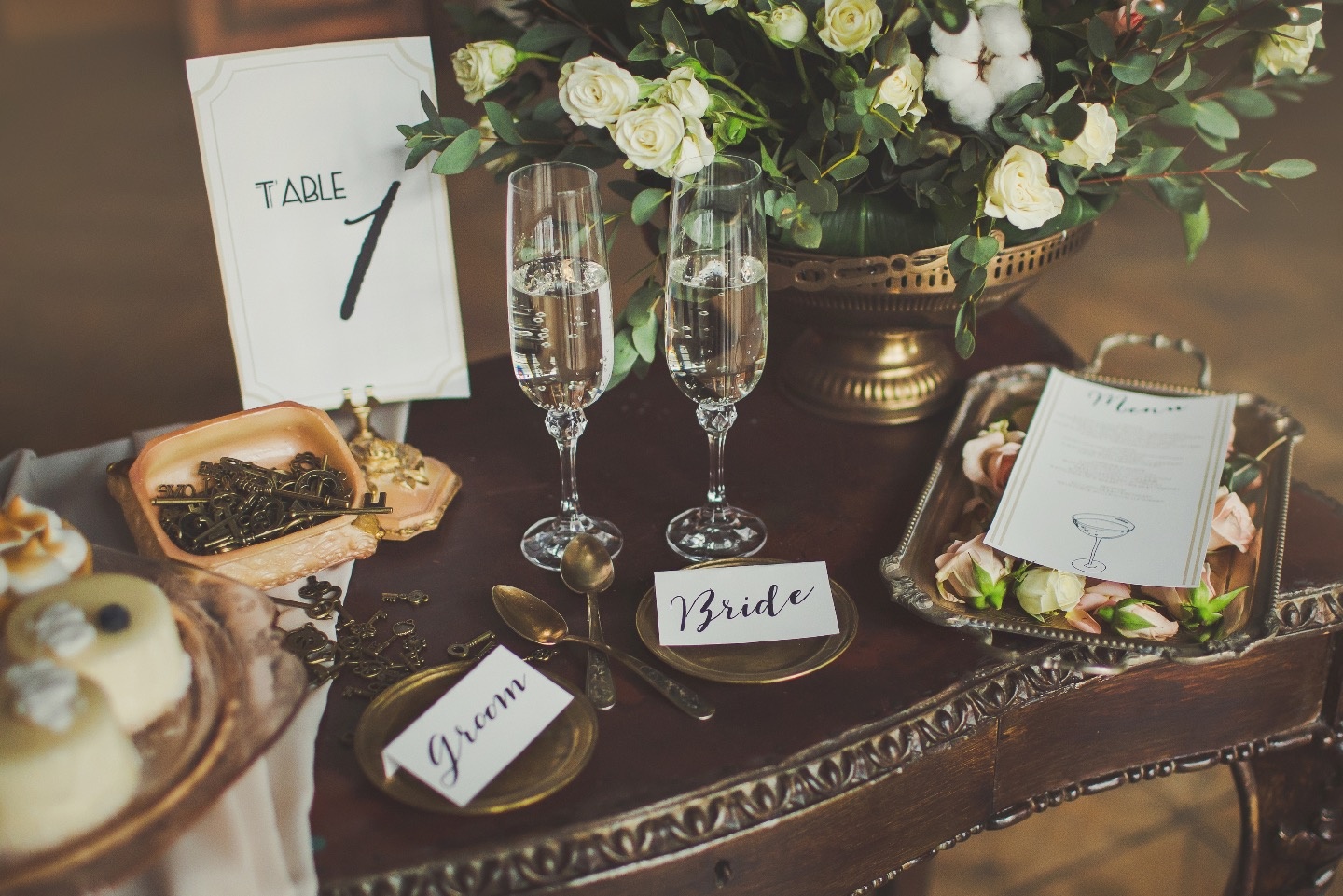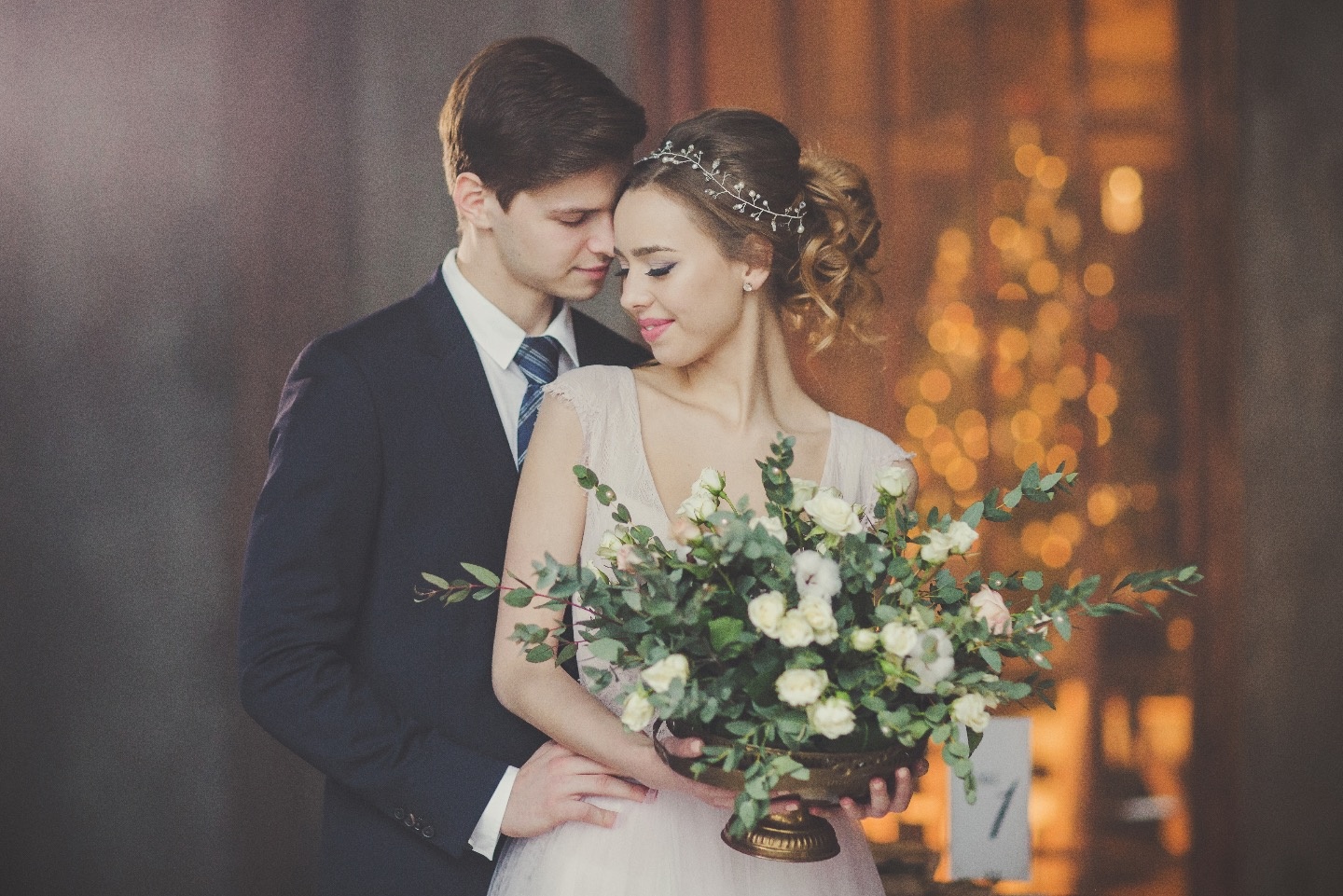 Для съемки была выбрана классика с элементами стиля Гэтсби. Концепция заключалась в слиянии времен — современности и старины, а также в противопоставлении тяжелых и легких акцентов в декоре: антиквариат, золото, темное дерево и тяжелый интерьер, которые контрастируют с пыльно-розовым платьем невесты, кремовыми тонами и нежной, ненавязчивой флористикой.